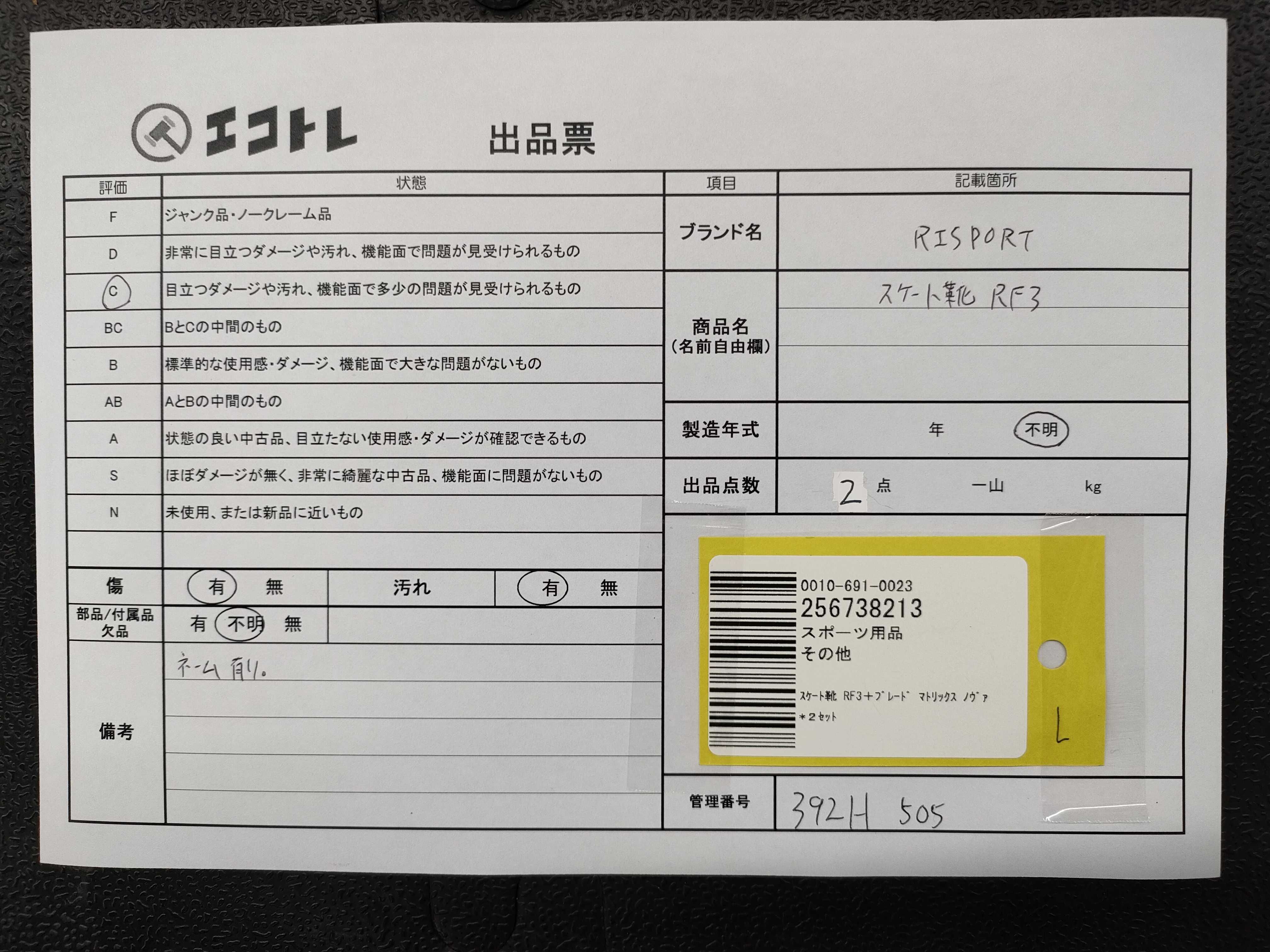 商品内容によって、JITBOXなどでの発送となる可能性がございます事ご理解下さい。年式などの商品情報詳細は写真にてご確認願います。※ご入札の際はご利用規約をよくお読みになってからのご参加お願いします。","タイプライン":"","カテゴリ":"スポーツ","形状コード":"その他スポーツ用品","付属品コード":"","シリアル・シール・型番":""