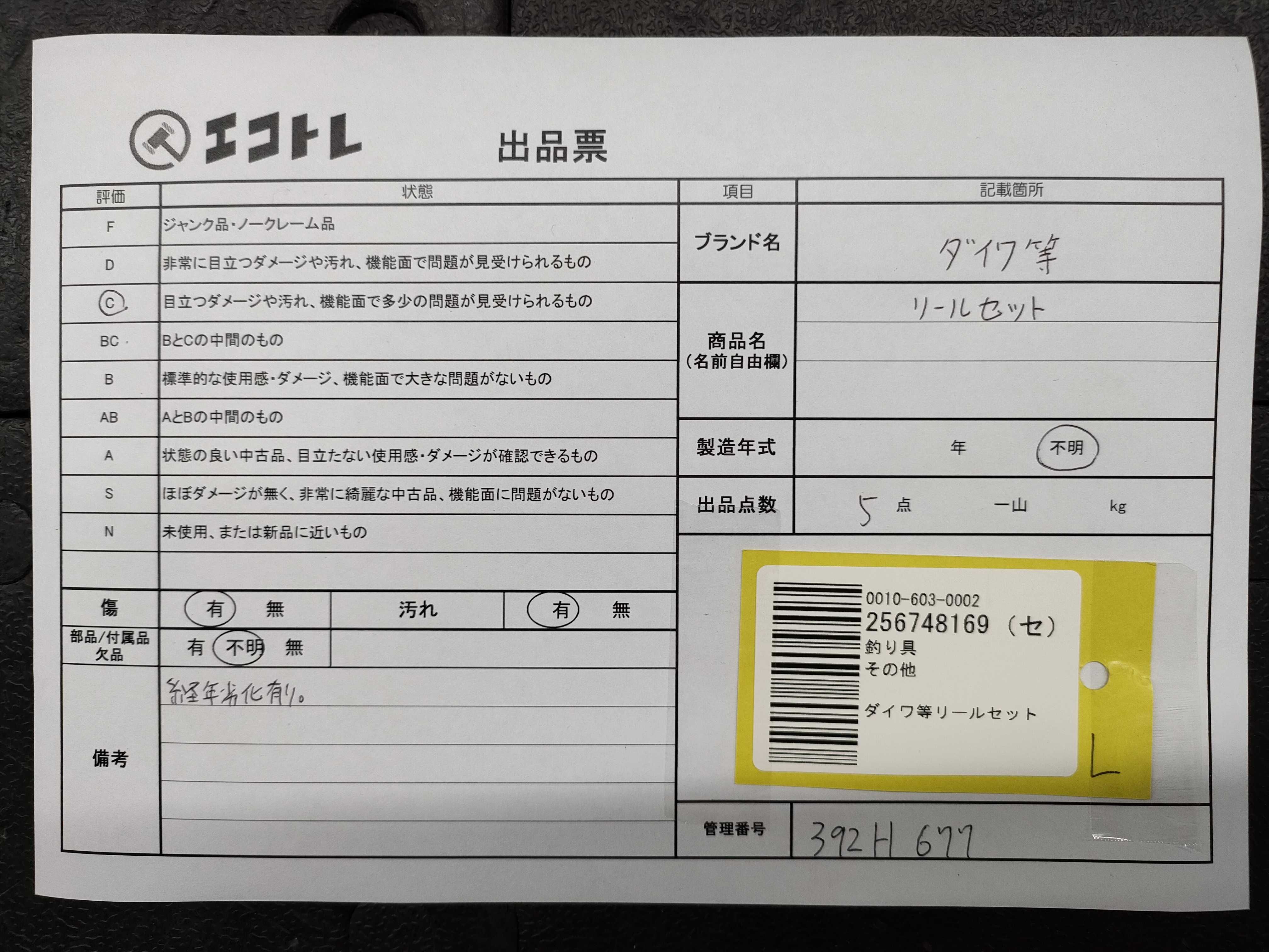 商品内容によって、JITBOXなどでの発送となる可能性がございます事ご理解下さい。年式などの商品情報詳細は写真にてご確認願います。※ご入札の際はご利用規約をよくお読みになってからのご参加お願いします。","タイプライン":"","カテゴリ":"スポーツ","形状コード":"フィッシング","付属品コード":"","シリアル・シール・型番":""