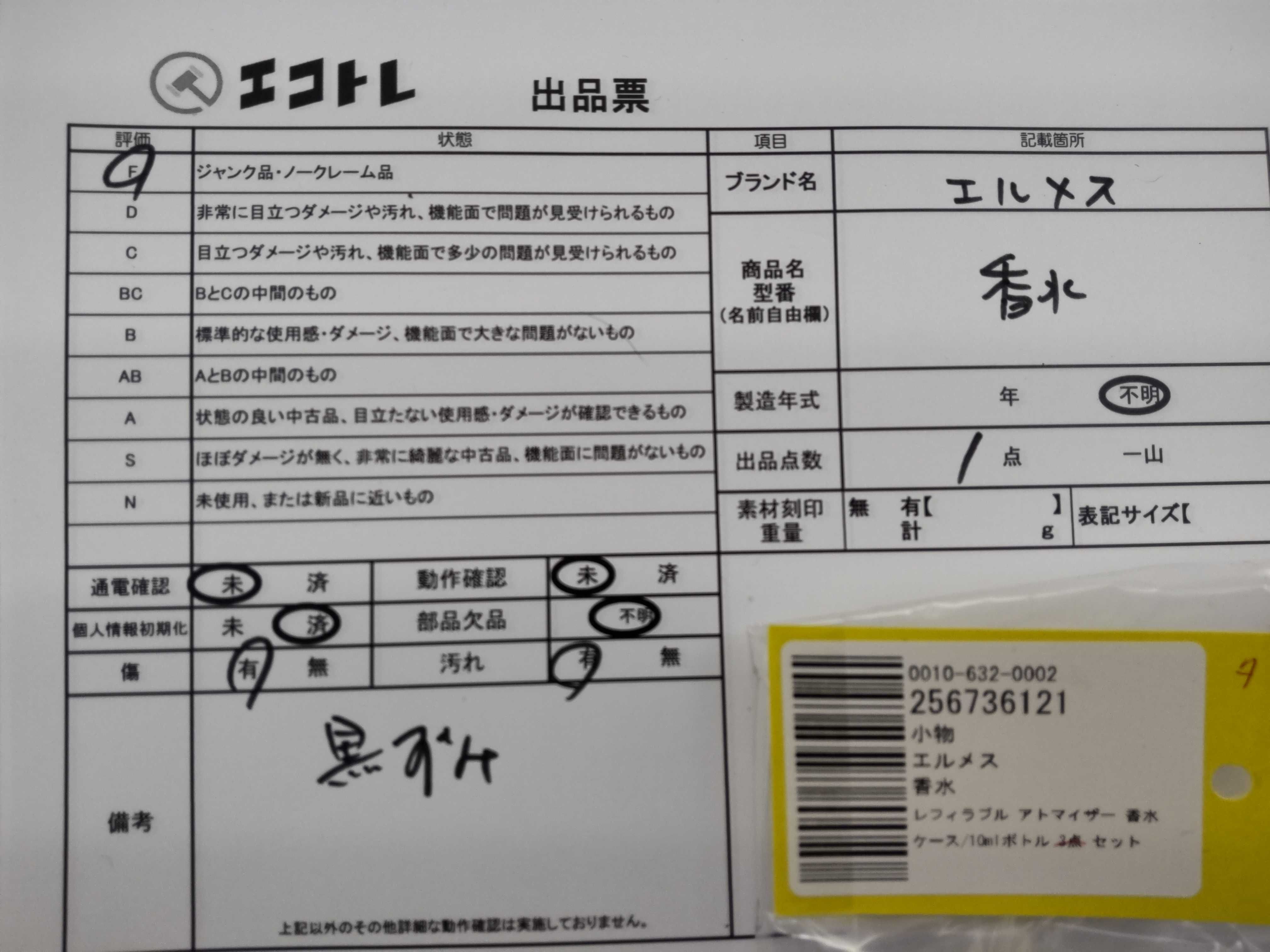 商品内容によって、JITBOXなどでの発送となる可能性がございます事ご理解下さい。年式などの商品情報詳細は写真にてご確認願います。※ご入札の際はご利用規約をよくお読みになってからのご参加お願いします。","タイプライン":"","カテゴリ":"消耗品","形状コード":"香水","付属品コード":"","シリアル・シール・型番":""
