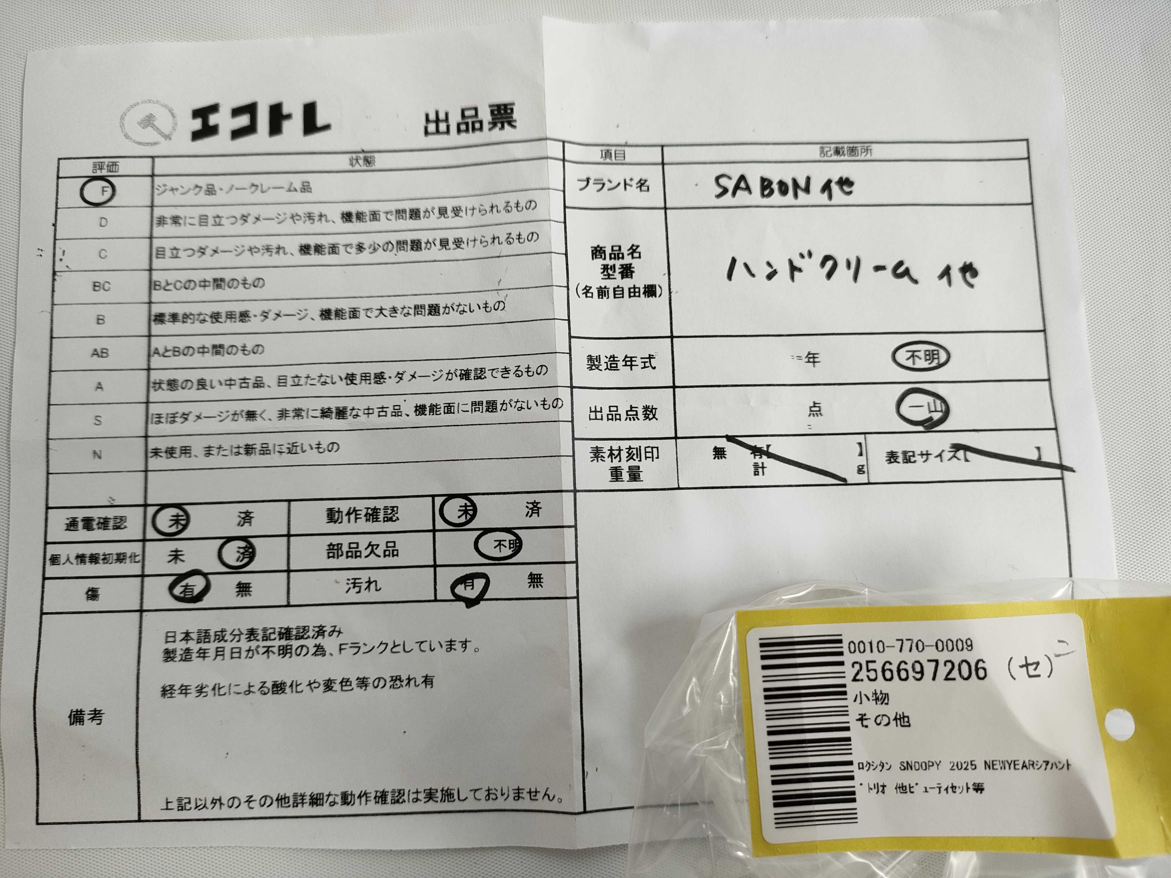 商品内容によって、JITBOXなどでの発送となる可能性がございます事ご理解下さい。年式などの商品情報詳細は写真にてご確認願います。※ご入札の際はご利用規約をよくお読みになってからのご参加お願いします。","タイプライン":"","カテゴリ":"消耗品","形状コード":"コスメ","付属品コード":"","シリアル・シール・型番":""