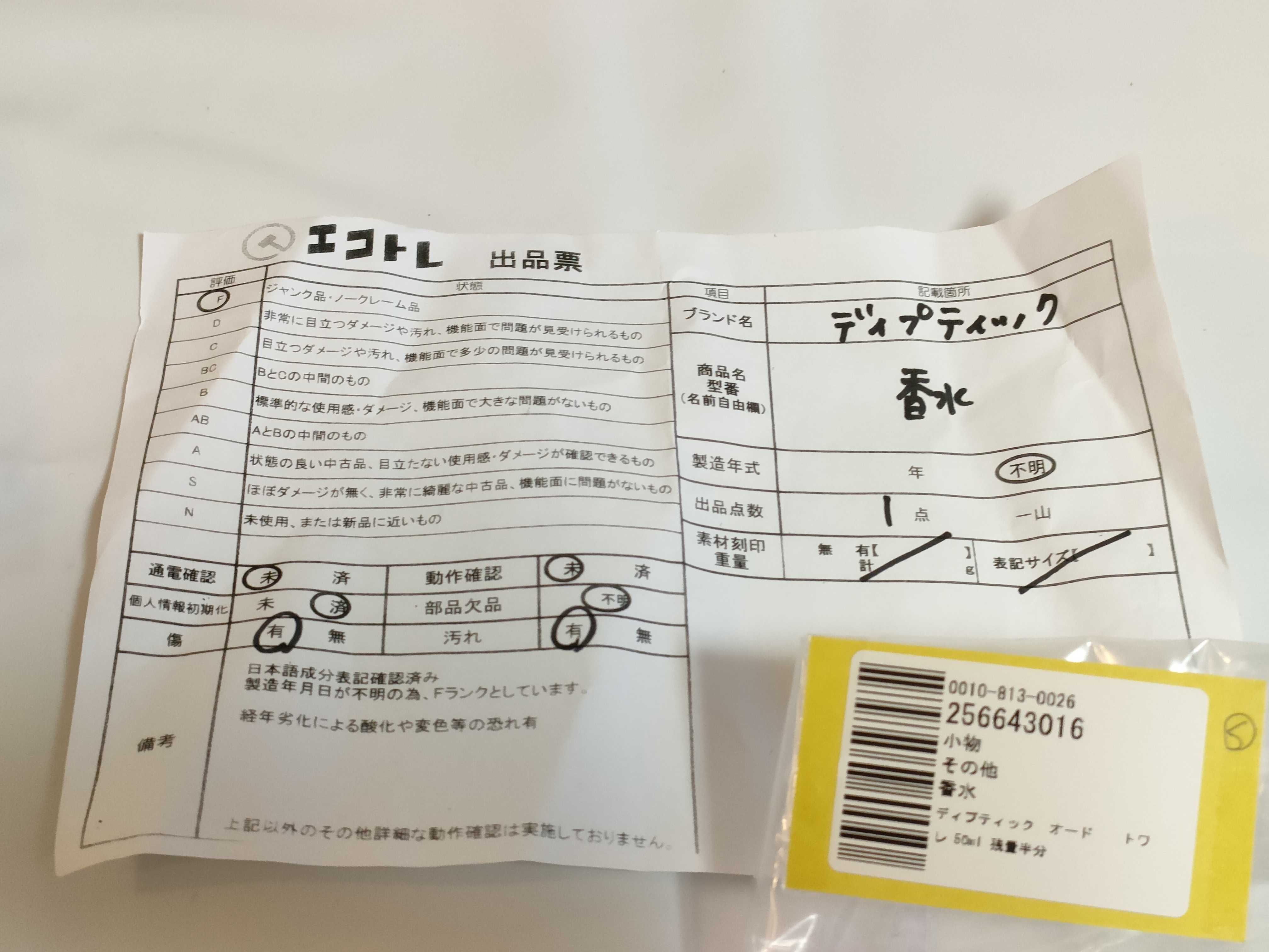 商品内容によって、JITBOXなどでの発送となる可能性がございます事ご理解下さい。年式などの商品情報詳細は写真にてご確認願います。※ご入札の際はご利用規約をよくお読みになってからのご参加お願いします。","タイプライン":"","カテゴリ":"消耗品","形状コード":"香水","付属品コード":"","シリアル・シール・型番":""