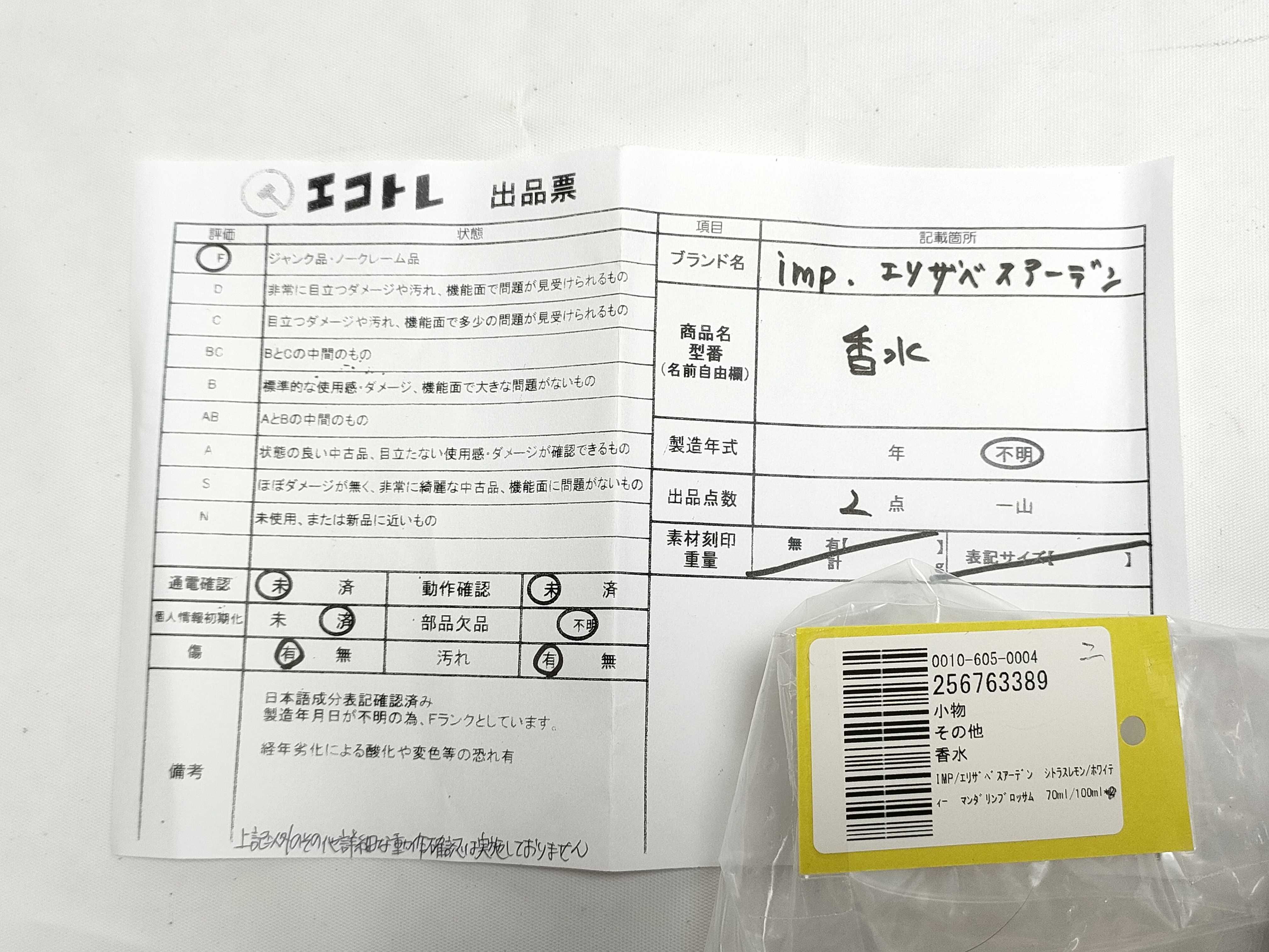 商品内容によって、JITBOXなどでの発送となる可能性がございます事ご理解下さい。年式などの商品情報詳細は写真にてご確認願います。※ご入札の際はご利用規約をよくお読みになってからのご参加お願いします。","タイプライン":"","カテゴリ":"消耗品","形状コード":"香水","付属品コード":"","シリアル・シール・型番":""