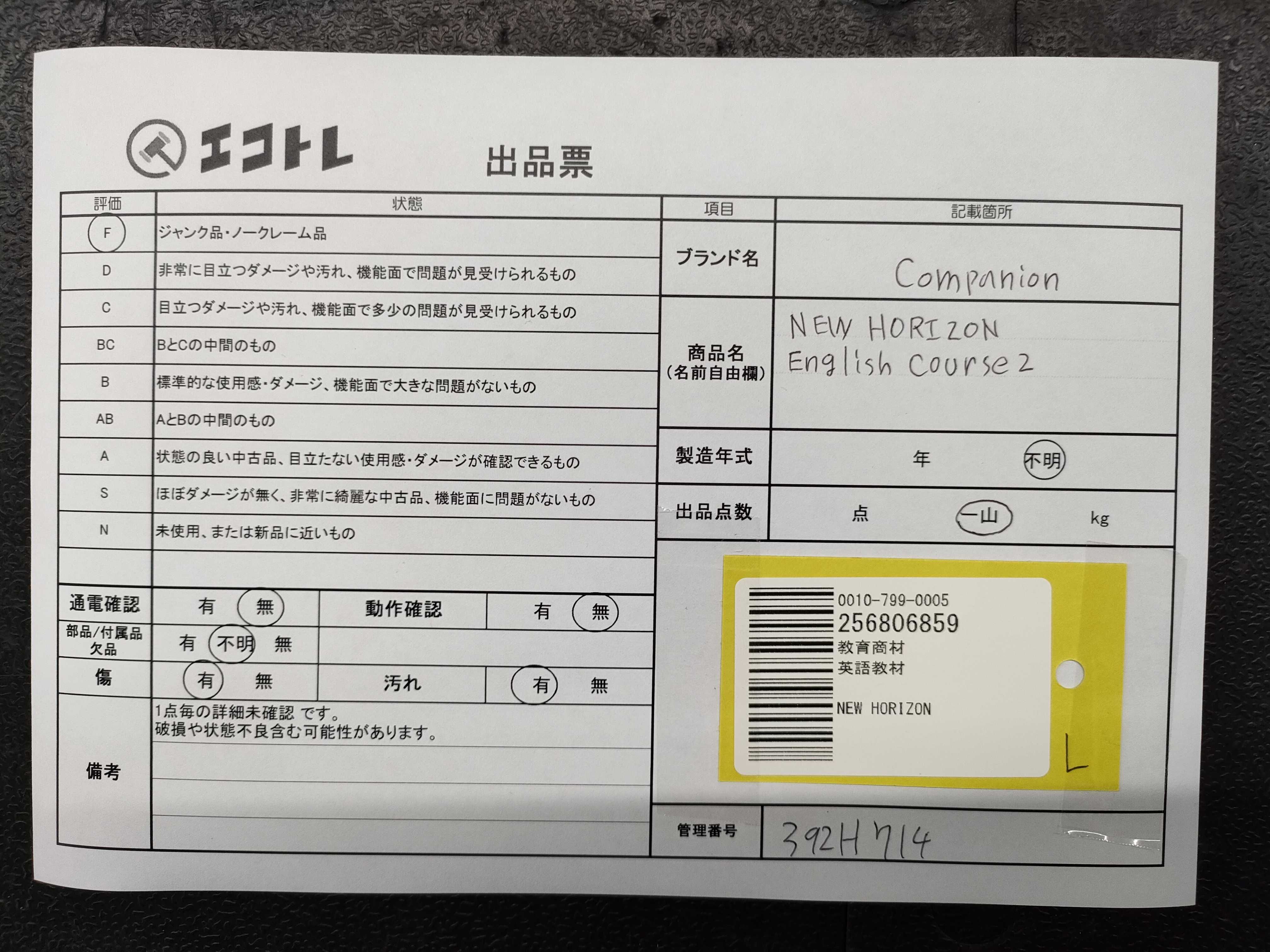商品内容によって、JITBOXなどでの発送となる可能性がございます事ご理解下さい。年式などの商品情報詳細は写真にてご確認願います。※ご入札の際はご利用規約をよくお読みになってからのご参加お願いします。","タイプライン":"","カテゴリ":"教育","形状コード":"その他教材","付属品コード":"","シリアル・シール・型番":""
