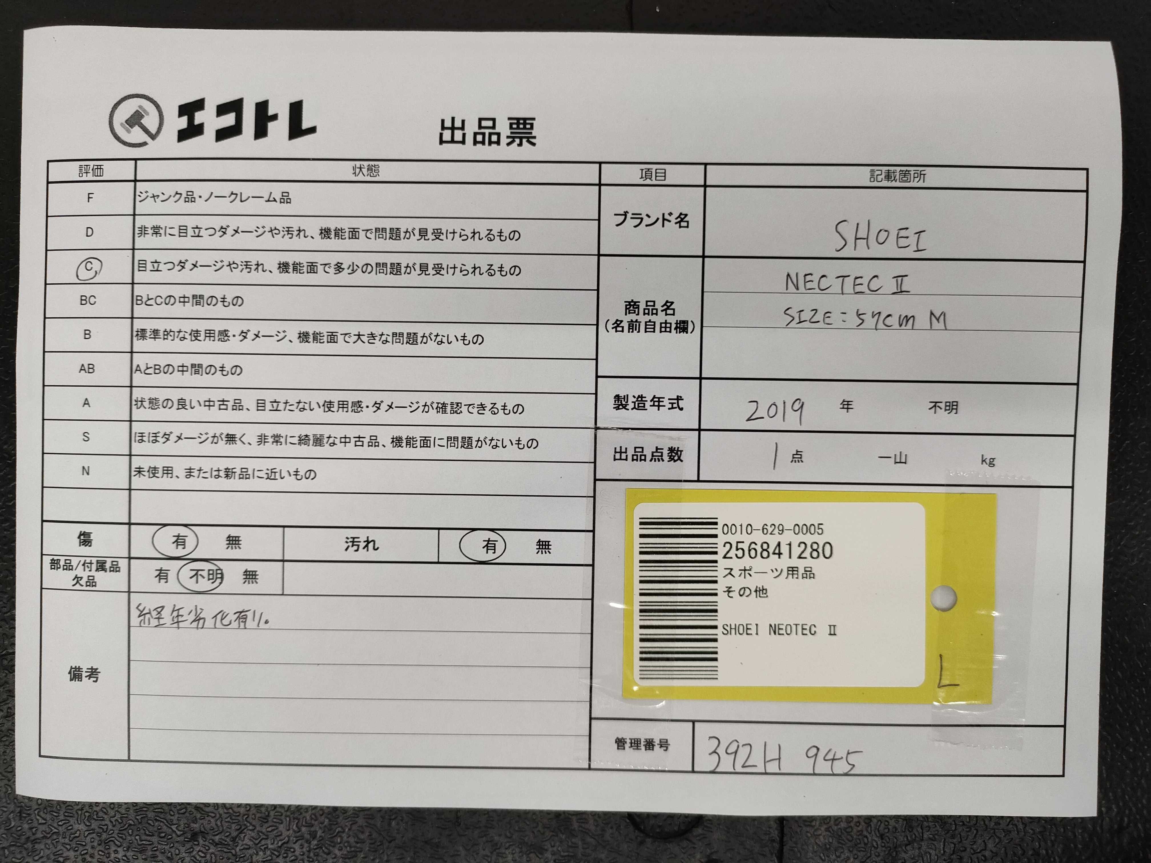 商品内容によって、JITBOXなどでの発送となる可能性がございます事ご理解下さい。年式などの商品情報詳細は写真にてご確認願います。※ご入札の際はご利用規約をよくお読みになってからのご参加お願いします。","タイプライン":"","カテゴリ":"カー・バイク用品","形状コード":"ヘルメット","付属品コード":"","シリアル・シール・型番":""