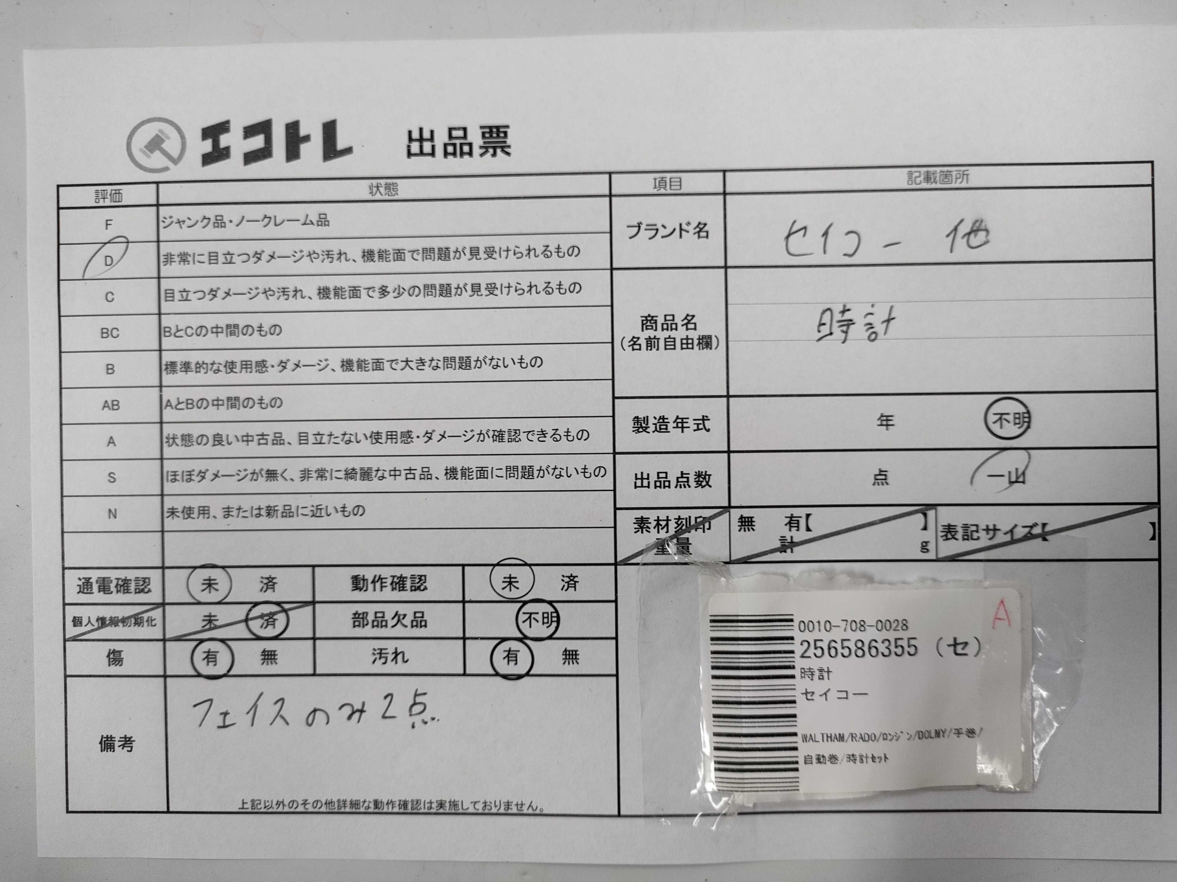 商品内容によって、JITBOXなどでの発送となる可能性がございます事ご理解下さい。年式などの商品情報詳細は写真にてご確認願います。※ご入札の際はご利用規約をよくお読みになってからのご参加お願いします。","タイプライン":"","カテゴリ":"時計","形状コード":"時計まとめ","付属品コード":"","シリアル・シール・型番":""