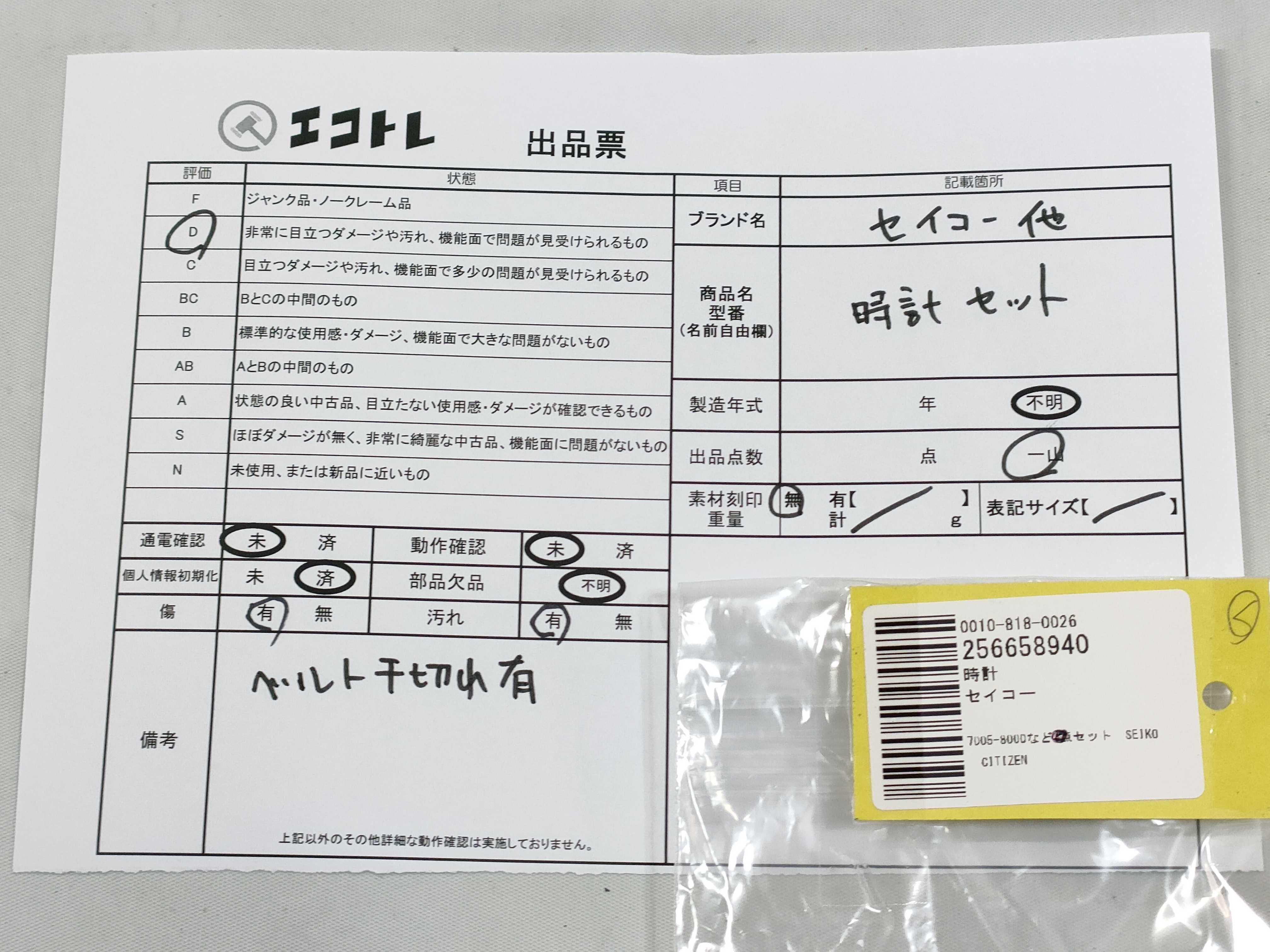 商品内容によって、JITBOXなどでの発送となる可能性がございます事ご理解下さい。年式などの商品情報詳細は写真にてご確認願います。※ご入札の際はご利用規約をよくお読みになってからのご参加お願いします。","タイプライン":"","カテゴリ":"時計","形状コード":"時計まとめ","付属品コード":"","シリアル・シール・型番":""