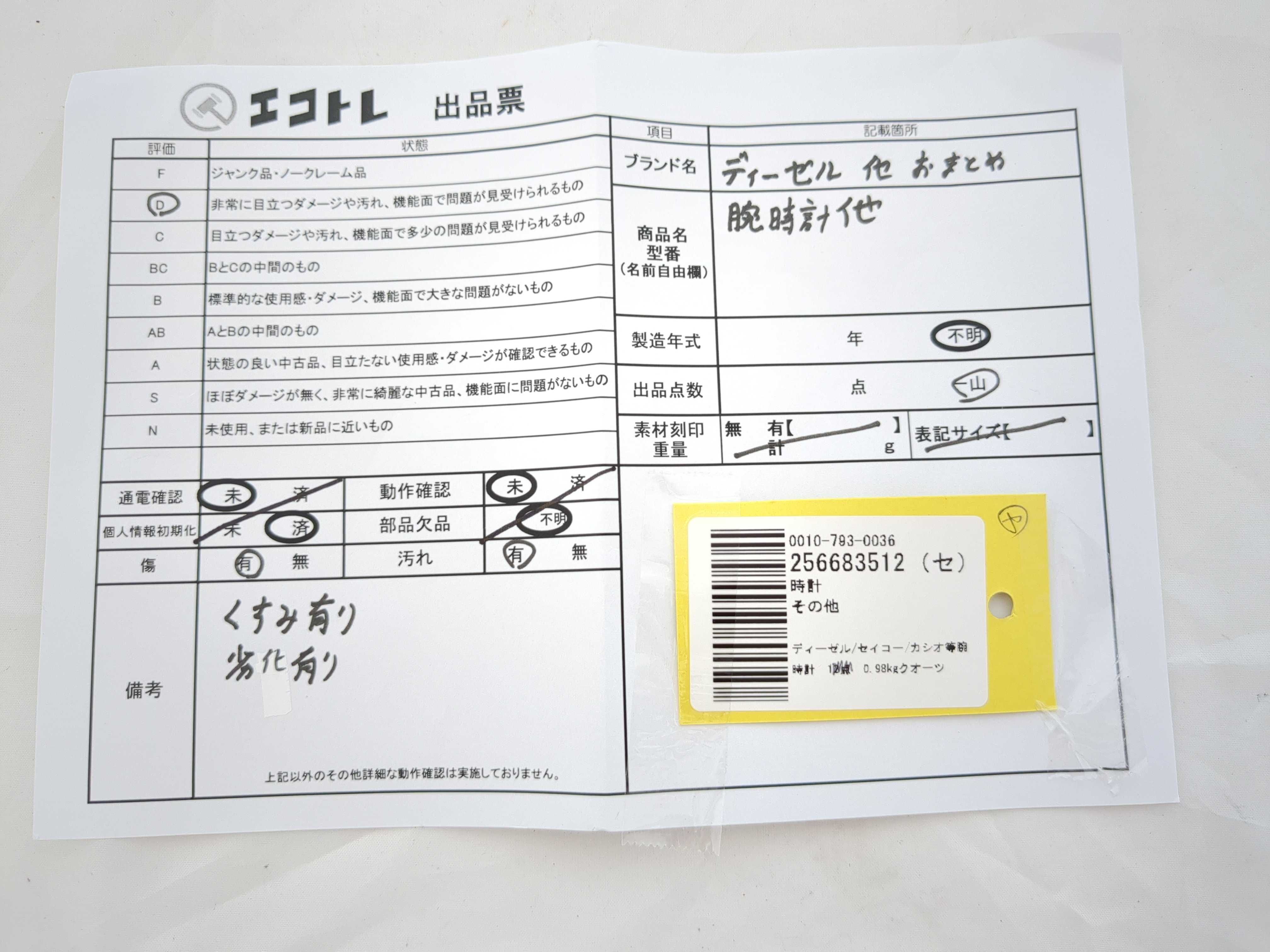 商品内容によって、JITBOXなどでの発送となる可能性がございます事ご理解下さい。年式などの商品情報詳細は写真にてご確認願います。※ご入札の際はご利用規約をよくお読みになってからのご参加お願いします。","タイプライン":"","カテゴリ":"時計","形状コード":"時計まとめ","付属品コード":"","シリアル・シール・型番":""