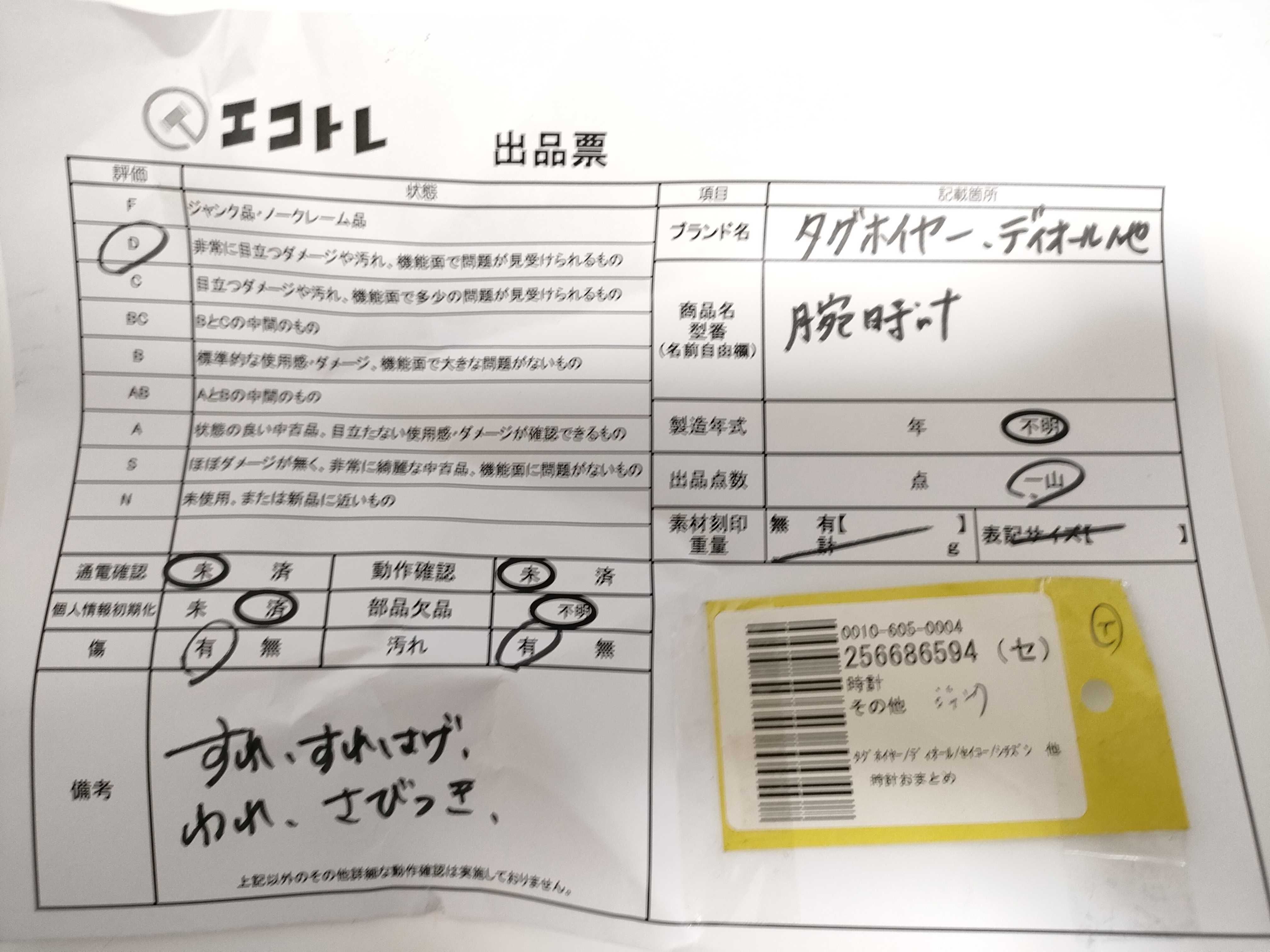商品内容によって、JITBOXなどでの発送となる可能性がございます事ご理解下さい。年式などの商品情報詳細は写真にてご確認願います。※ご入札の際はご利用規約をよくお読みになってからのご参加お願いします。","タイプライン":"","カテゴリ":"時計","形状コード":"時計まとめ","付属品コード":"","シリアル・シール・型番":""
