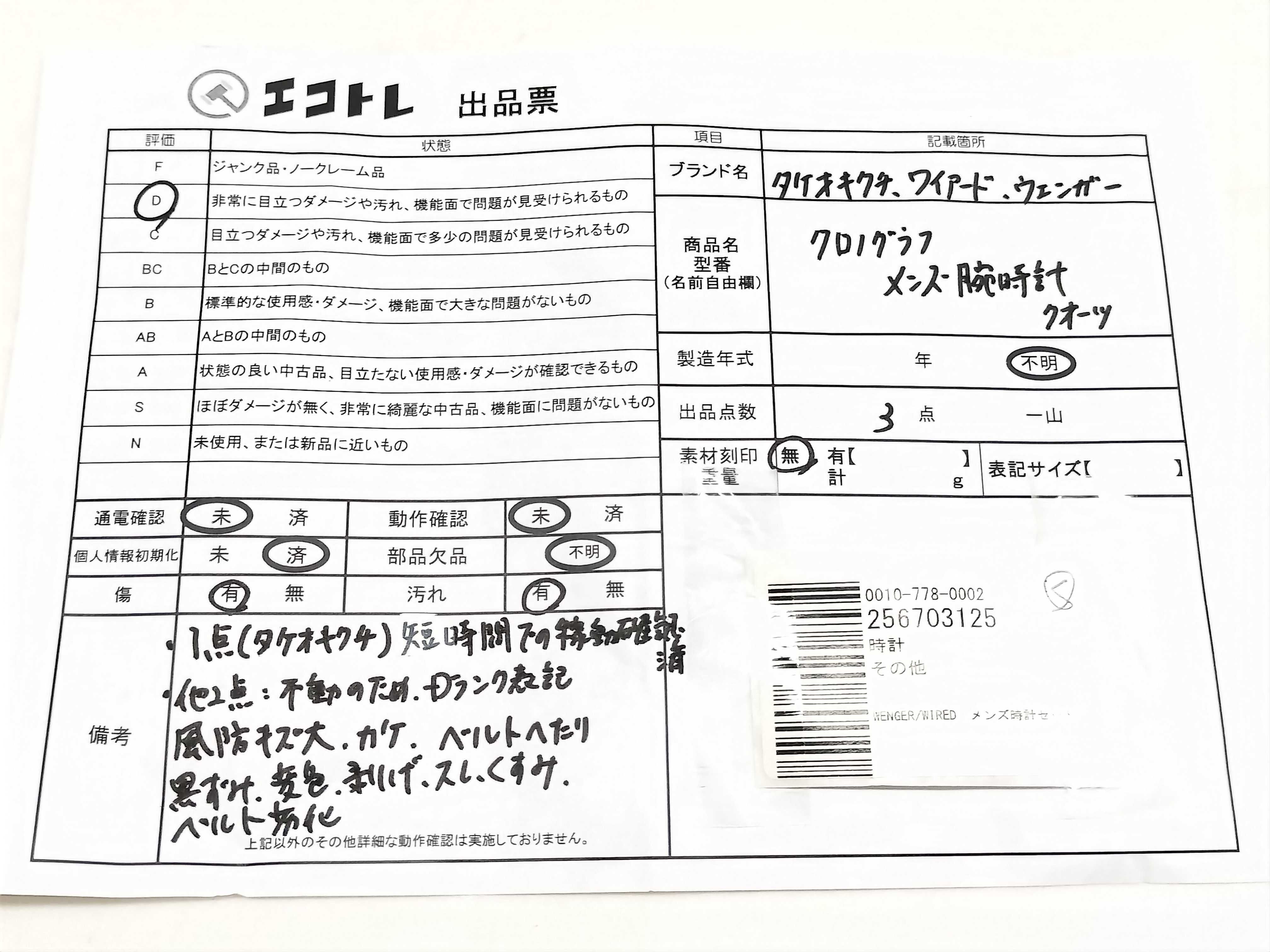 商品内容によって、JITBOXなどでの発送となる可能性がございます事ご理解下さい。年式などの商品情報詳細は写真にてご確認願います。※ご入札の際はご利用規約をよくお読みになってからのご参加お願いします。","タイプライン":"","カテゴリ":"時計","形状コード":"時計まとめ","付属品コード":"","シリアル・シール・型番":""