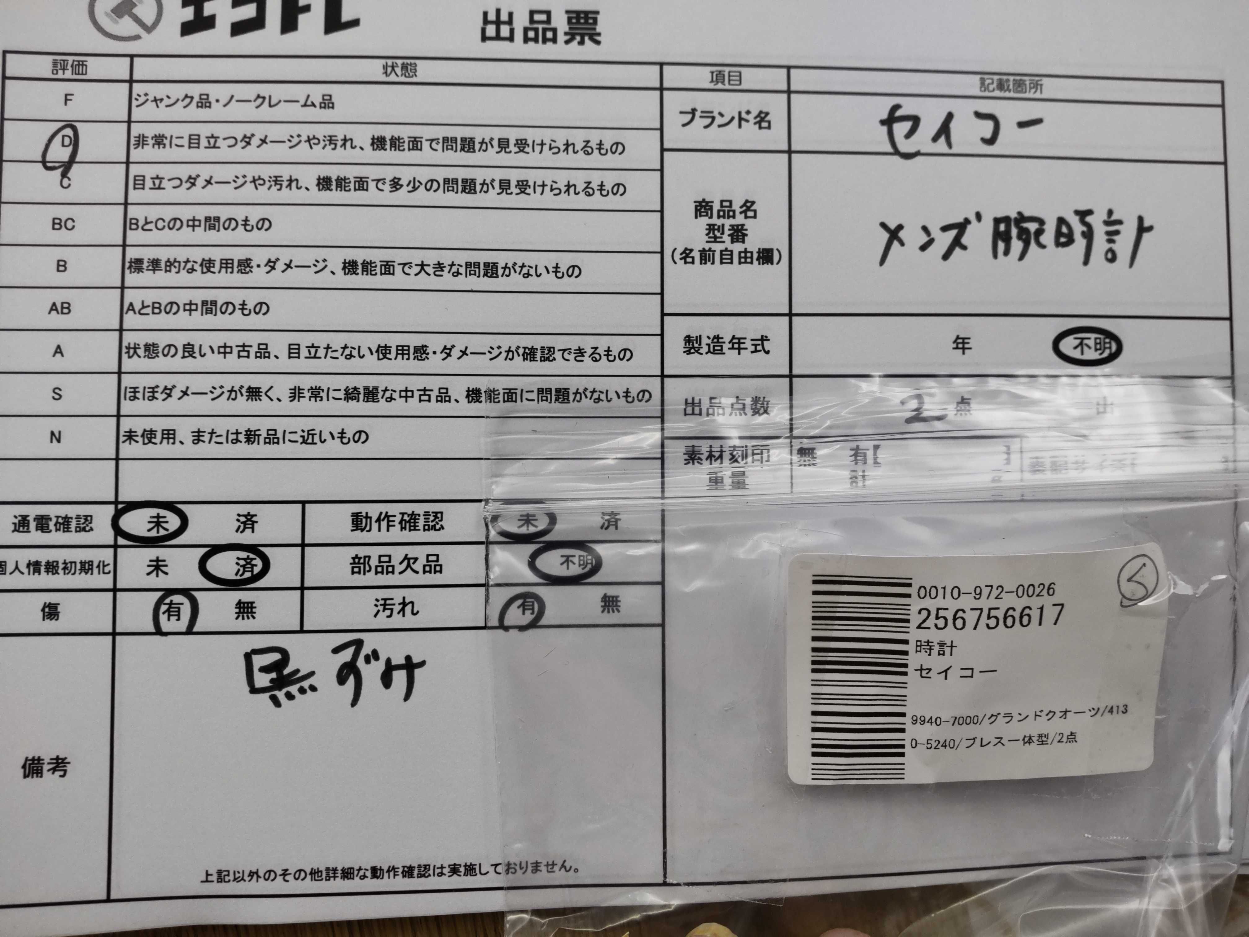 商品内容によって、JITBOXなどでの発送となる可能性がございます事ご理解下さい。年式などの商品情報詳細は写真にてご確認願います。※ご入札の際はご利用規約をよくお読みになってからのご参加お願いします。","タイプライン":"","カテゴリ":"時計","形状コード":"メンズ腕時計","付属品コード":"","シリアル・シール・型番":""