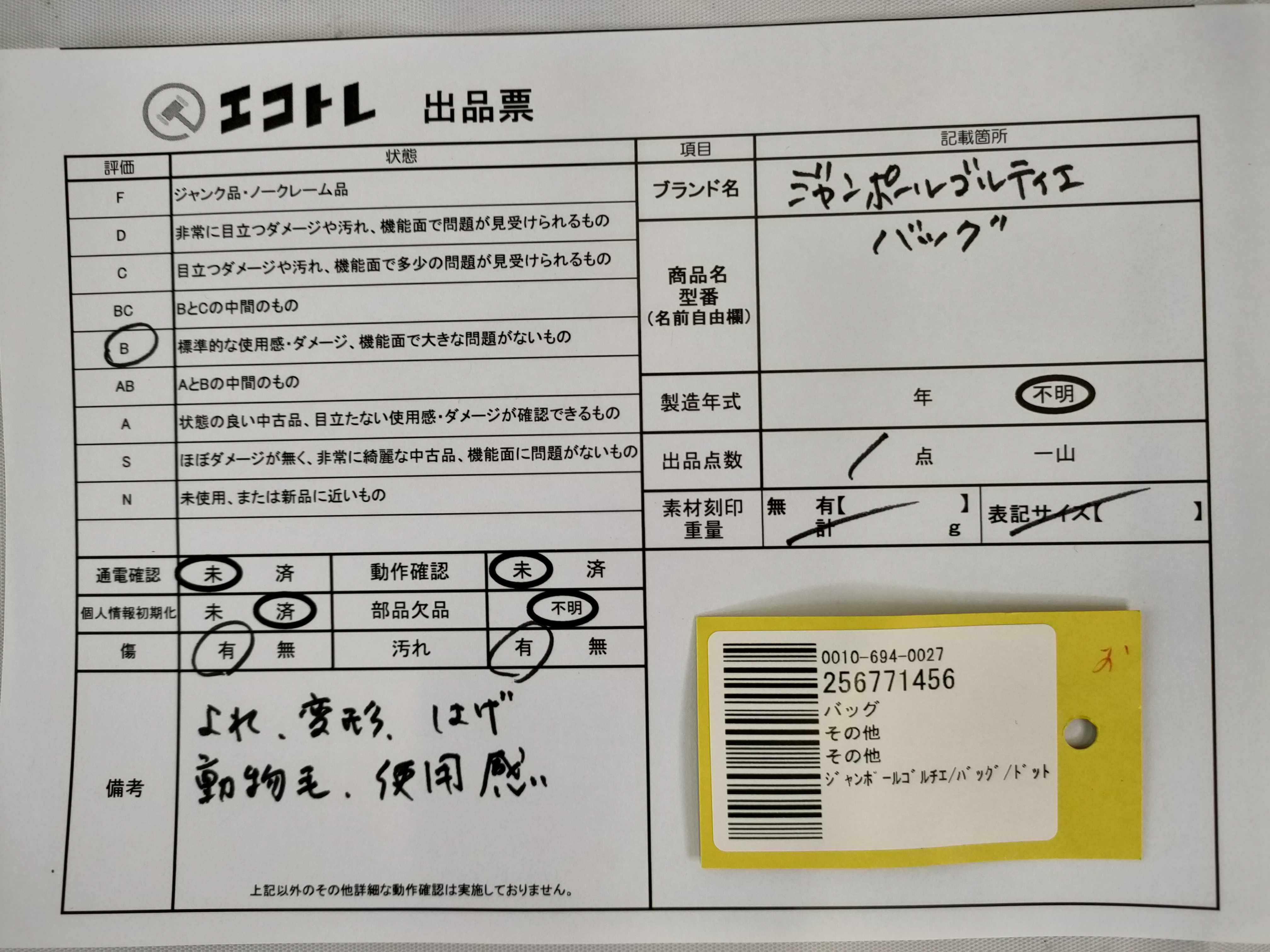 商品内容によって、JITBOXなどでの発送となる可能性がございます事ご理解下さい。年式などの商品情報詳細は写真にてご確認願います。※ご入札の際はご利用規約をよくお読みになってからのご参加お願いします。","タイプライン":"","カテゴリ":"バッグ","形状コード":"バッグ","付属品コード":"","シリアル・シール・型番":""