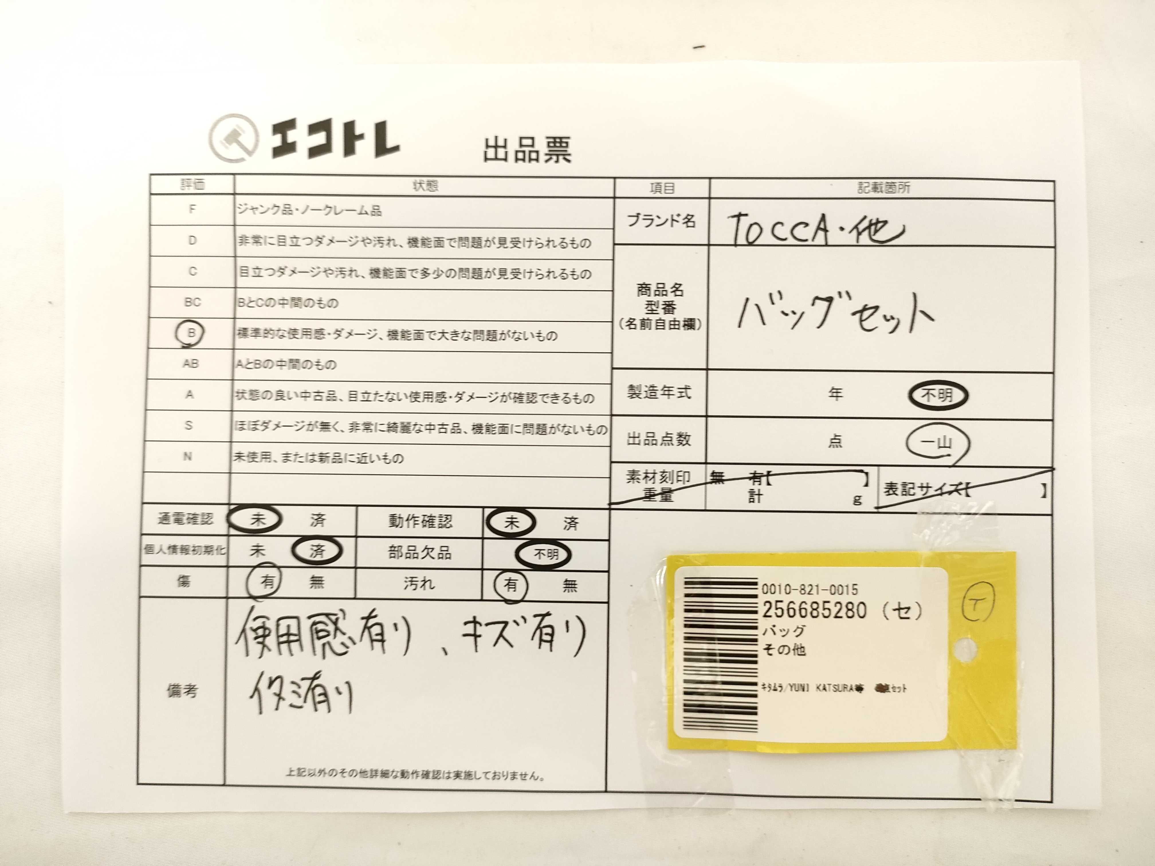 商品内容によって、JITBOXなどでの発送となる可能性がございます事ご理解下さい。年式などの商品情報詳細は写真にてご確認願います。※ご入札の際はご利用規約をよくお読みになってからのご参加お願いします。","タイプライン":"","カテゴリ":"バッグ","形状コード":"トートバッグ","付属品コード":"","シリアル・シール・型番":""