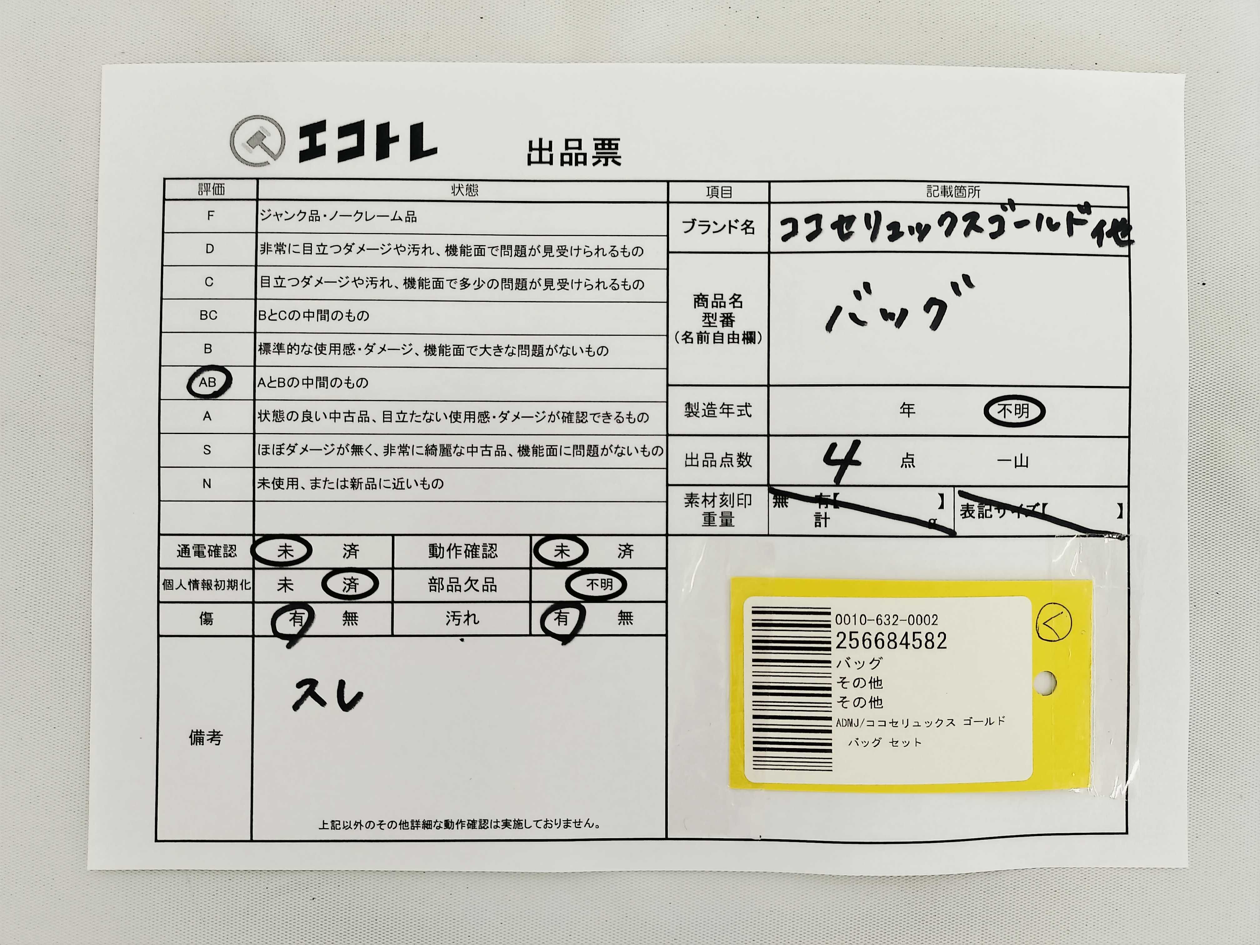 商品内容によって、JITBOXなどでの発送となる可能性がございます事ご理解下さい。年式などの商品情報詳細は写真にてご確認願います。※ご入札の際はご利用規約をよくお読みになってからのご参加お願いします。","タイプライン":"","カテゴリ":"バッグ","形状コード":"バッグ","付属品コード":"","シリアル・シール・型番":""