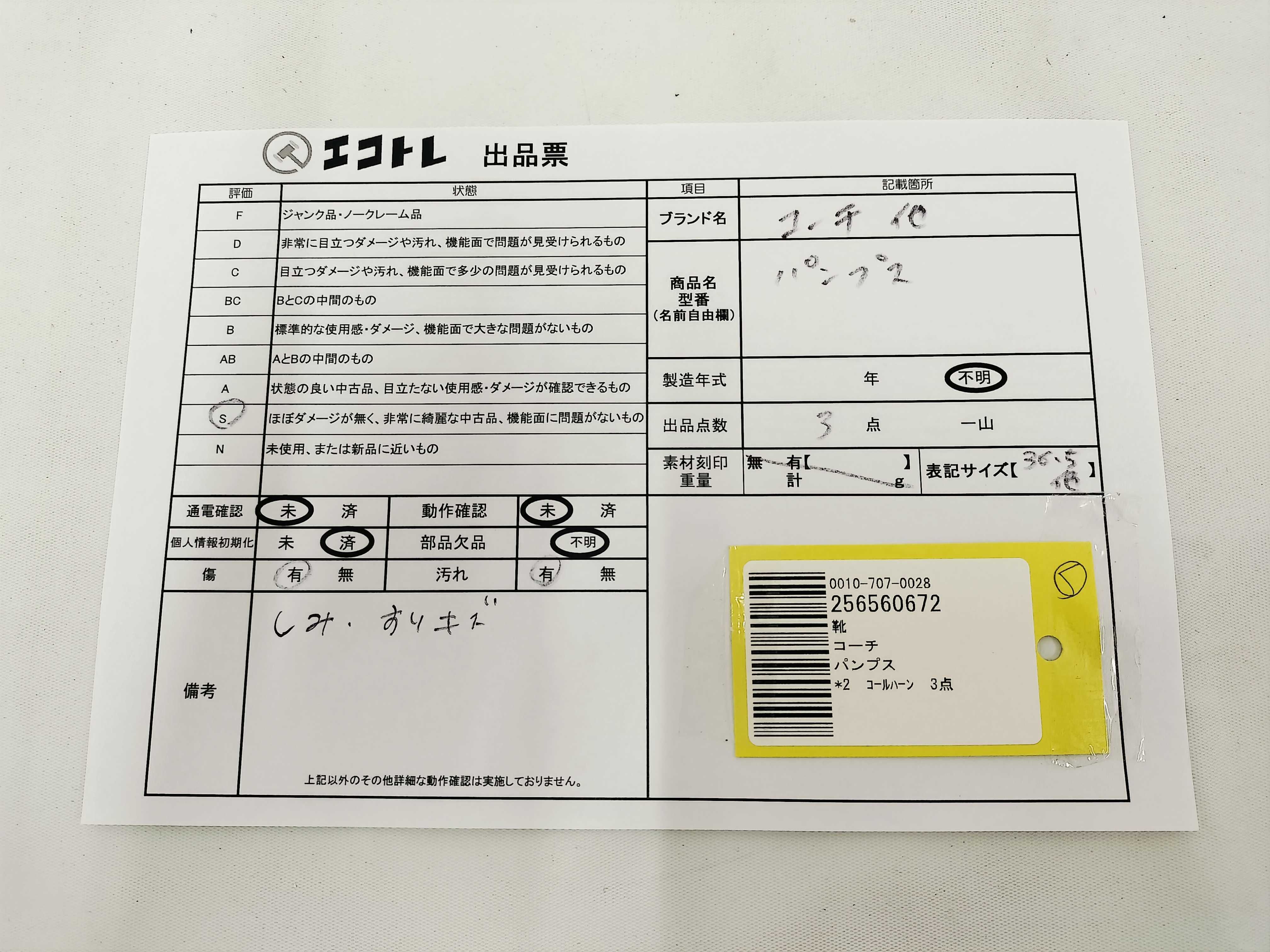 商品内容によって、JITBOXなどでの発送となる可能性がございます事ご理解下さい。年式などの商品情報詳細は写真にてご確認願います。※ご入札の際はご利用規約をよくお読みになってからのご参加お願いします。","タイプライン":"","カテゴリ":"靴","形状コード":"パンプス","付属品コード":"","シリアル・シール・型番":""