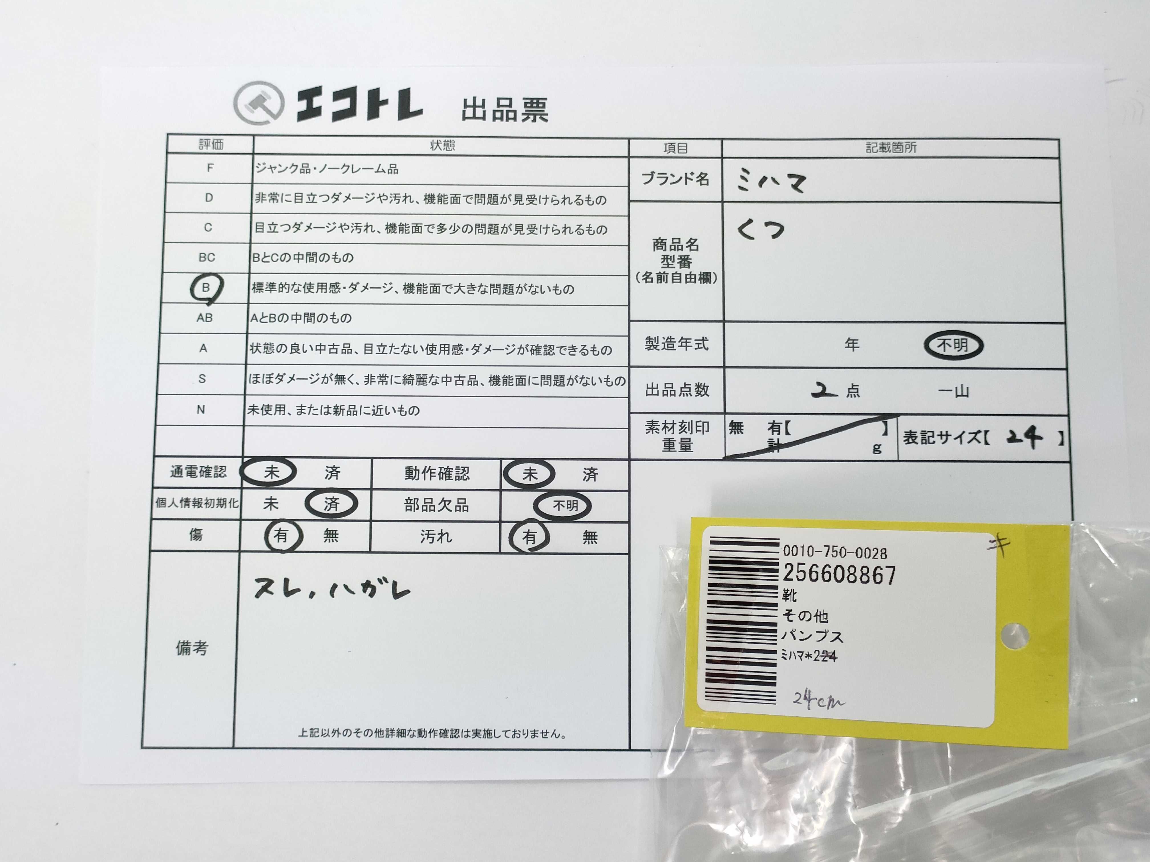 商品内容によって、JITBOXなどでの発送となる可能性がございます事ご理解下さい。年式などの商品情報詳細は写真にてご確認願います。※ご入札の際はご利用規約をよくお読みになってからのご参加お願いします。","タイプライン":"","カテゴリ":"靴","形状コード":"パンプス","付属品コード":"","シリアル・シール・型番":"24"