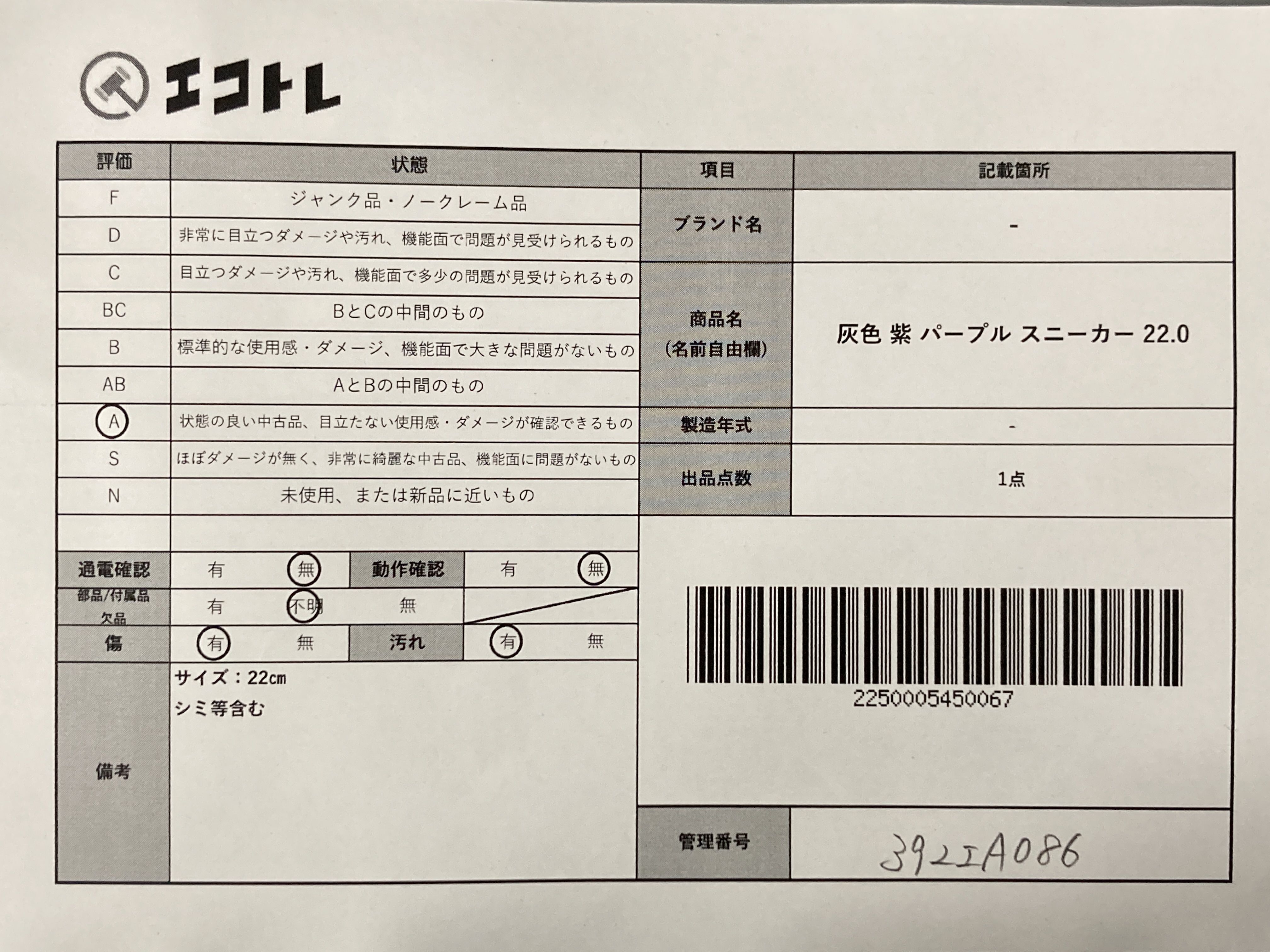 (B_1150)▼灰色 紫 パープル スニーカー 22.0