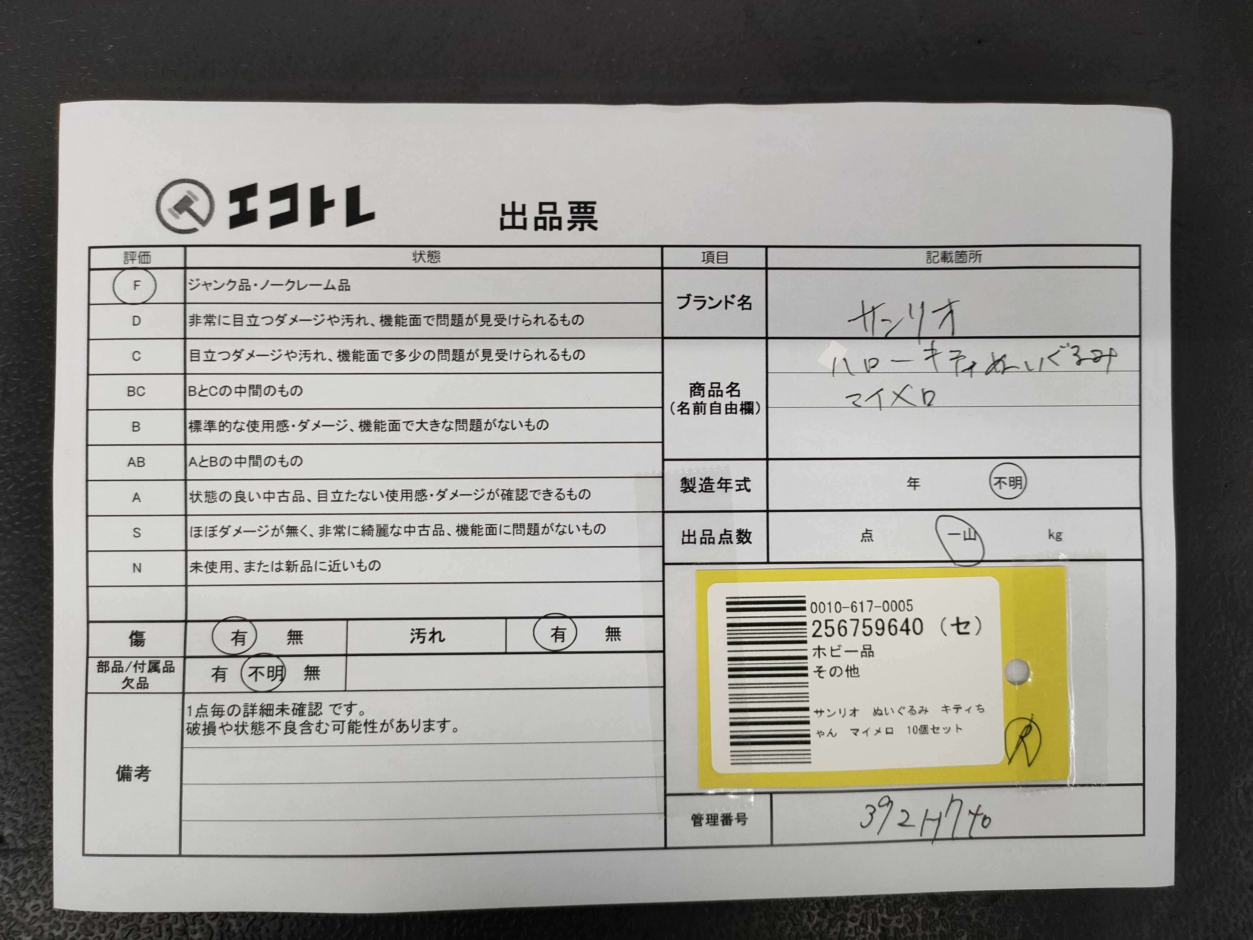 商品内容によって、JITBOXなどでの発送となる可能性がございます事ご理解下さい。年式などの商品情報詳細は写真にてご確認願います。※ご入札の際はご利用規約をよくお読みになってからのご参加お願いします。","タイプライン":"","カテゴリ":"ホビー","形状コード":"ぬいぐるみ","付属品コード":"","シリアル・シール・型番":""