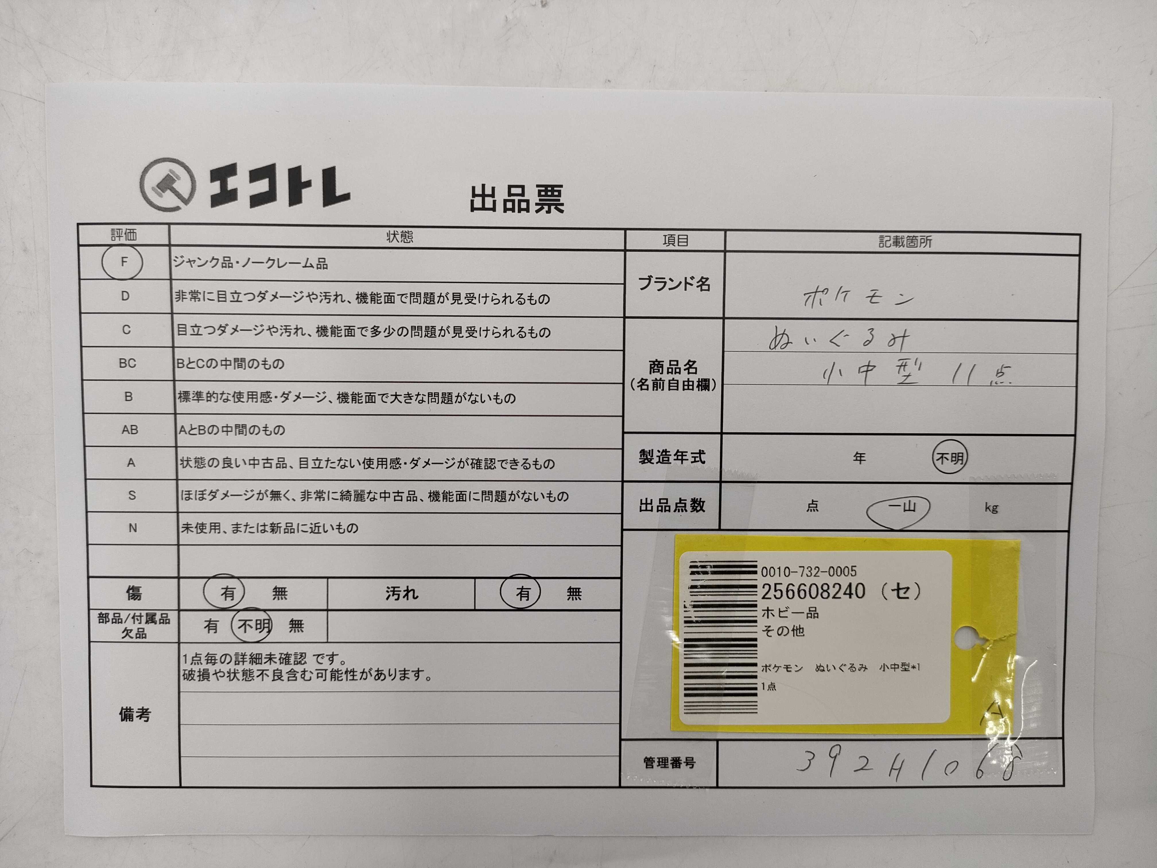 商品内容によって、JITBOXなどでの発送となる可能性がございます事ご理解下さい。年式などの商品情報詳細は写真にてご確認願います。※ご入札の際はご利用規約をよくお読みになってからのご参加お願いします。","タイプライン":"","カテゴリ":"ホビー","形状コード":"ぬいぐるみ","付属品コード":"","シリアル・シール・型番":""