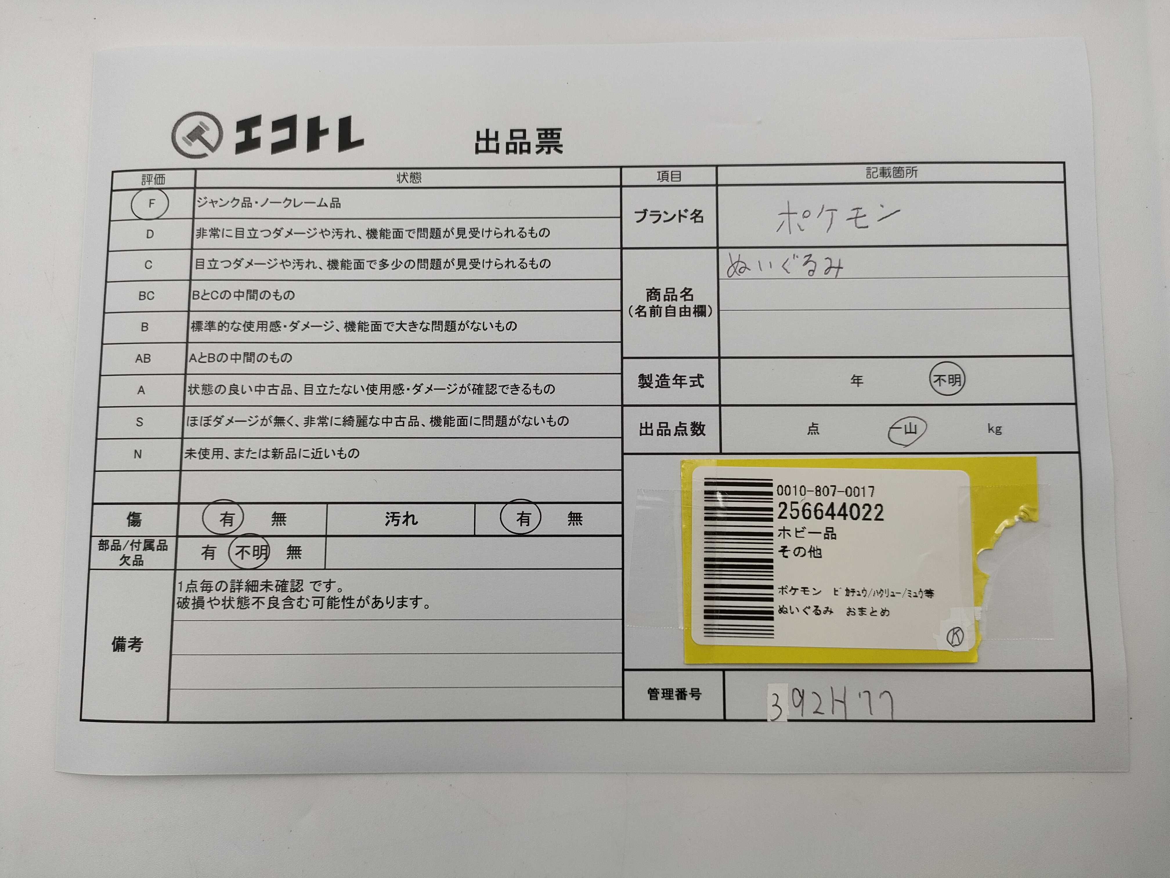 商品内容によって、JITBOXなどでの発送となる可能性がございます事ご理解下さい。年式などの商品情報詳細は写真にてご確認願います。※ご入札の際はご利用規約をよくお読みになってからのご参加お願いします。","タイプライン":"","カテゴリ":"ホビー","形状コード":"ぬいぐるみ","付属品コード":"","シリアル・シール・型番":""