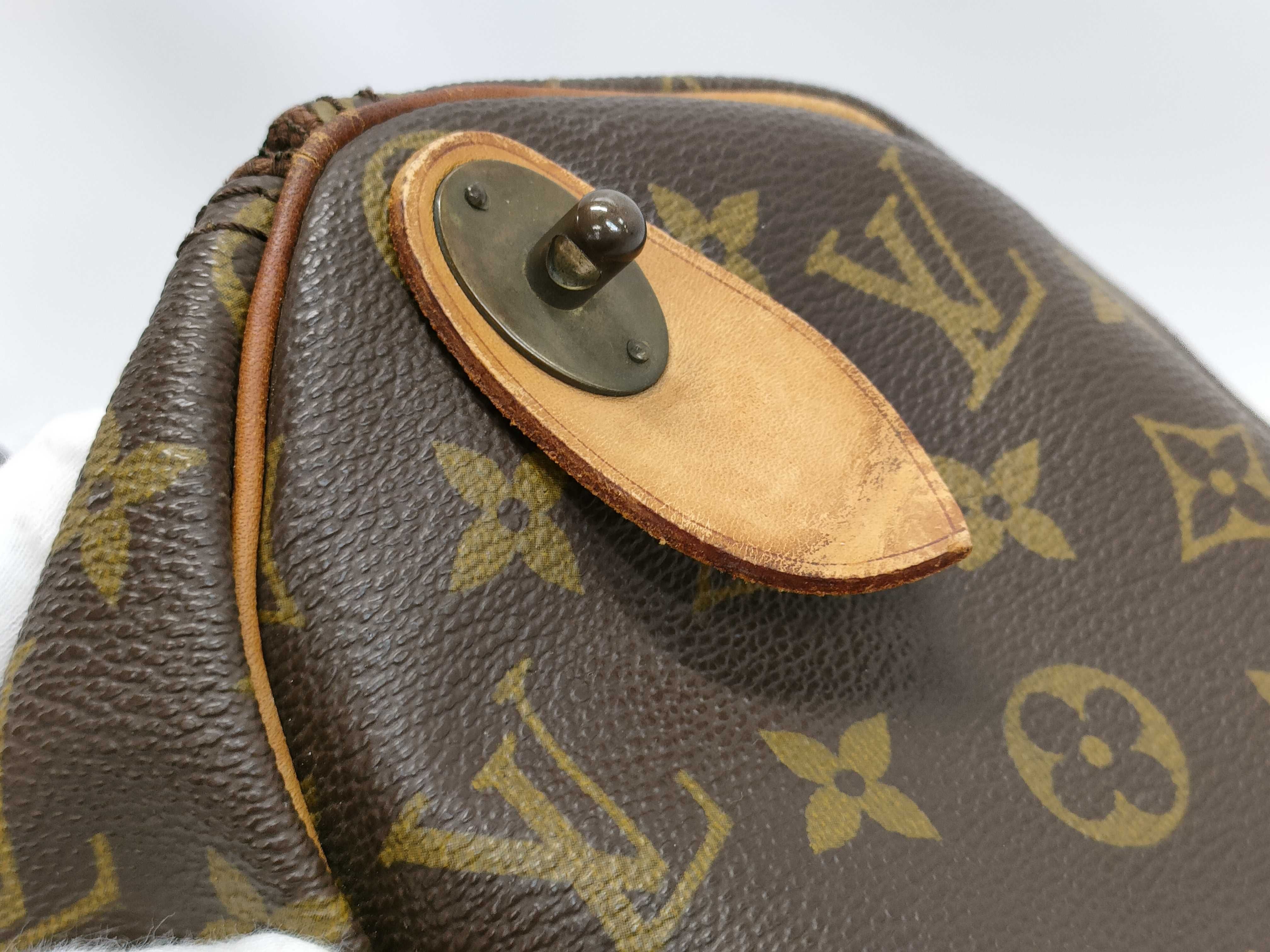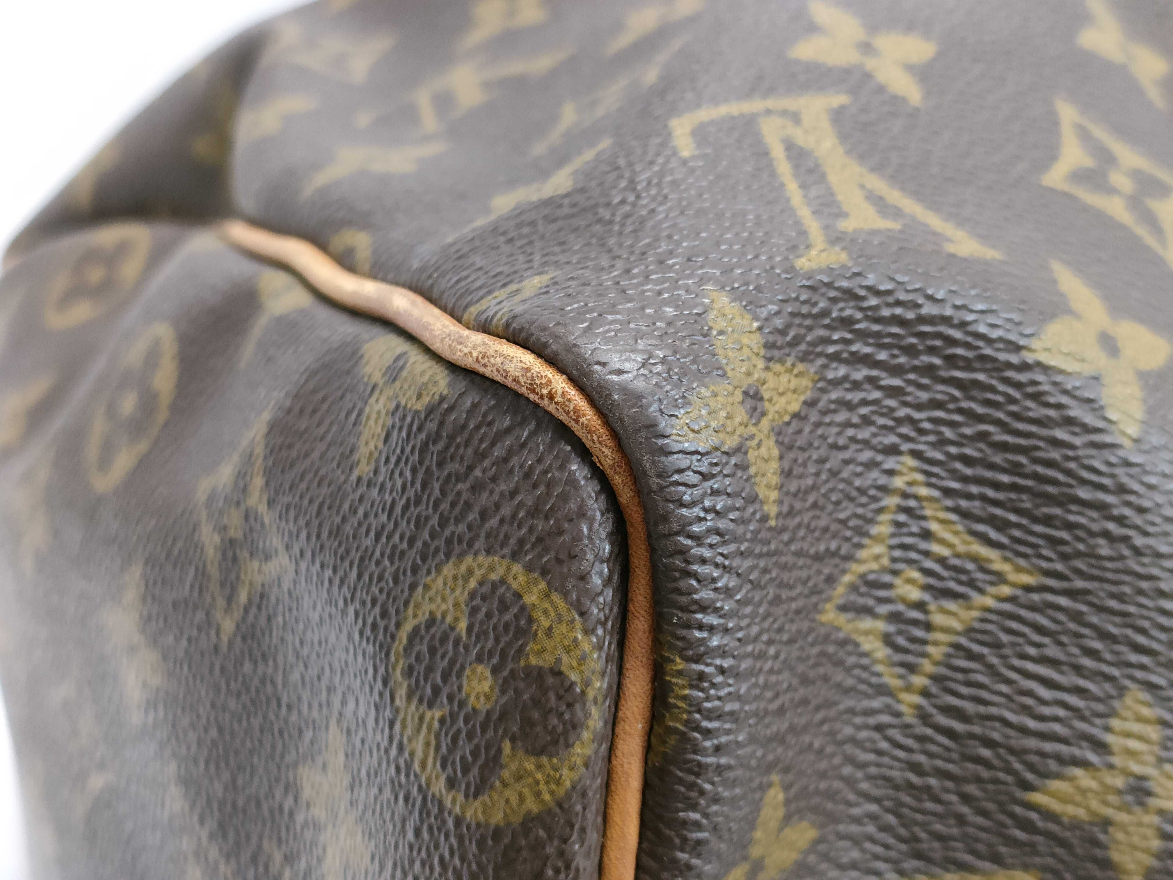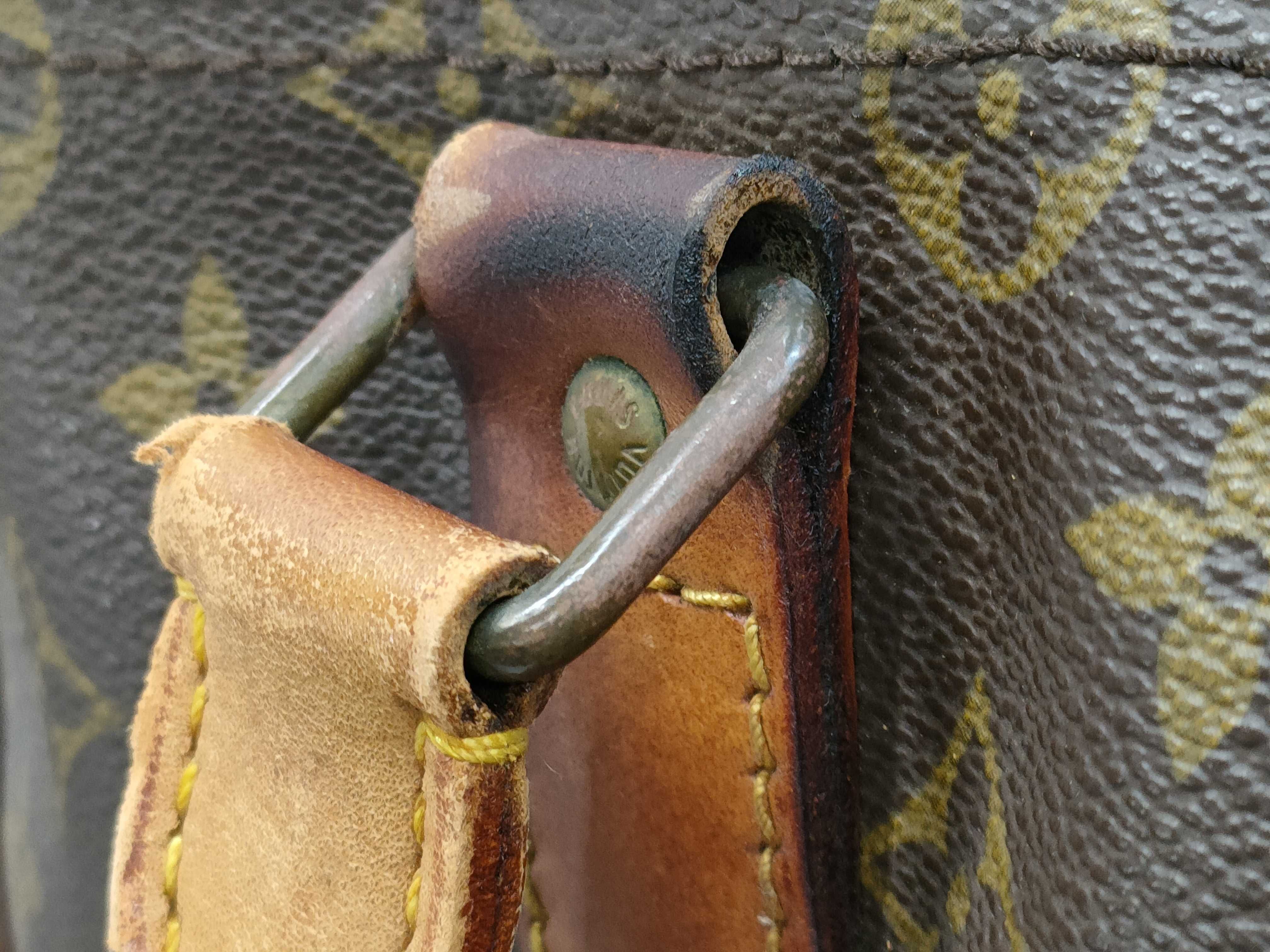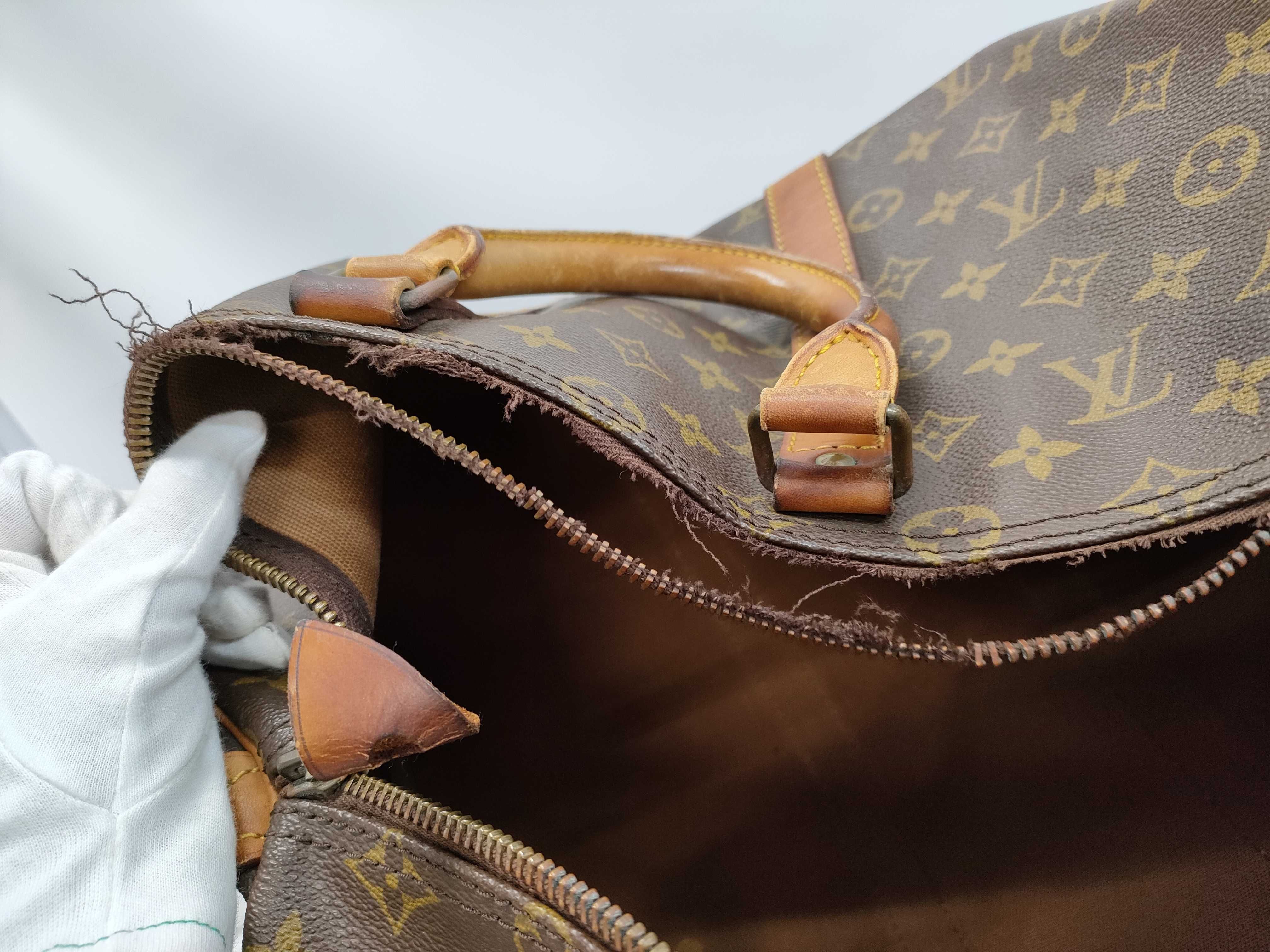 ヌメ革ヤケシミヒビ(中) 角擦れ(中) ファスナー破れ(大)・閉まらない 持ち手剥げ(中) プル革ヒビ(大) 内側色褪せ汚れ(中) ペン跡(中) サイド塗りつぶしあり【シリアル