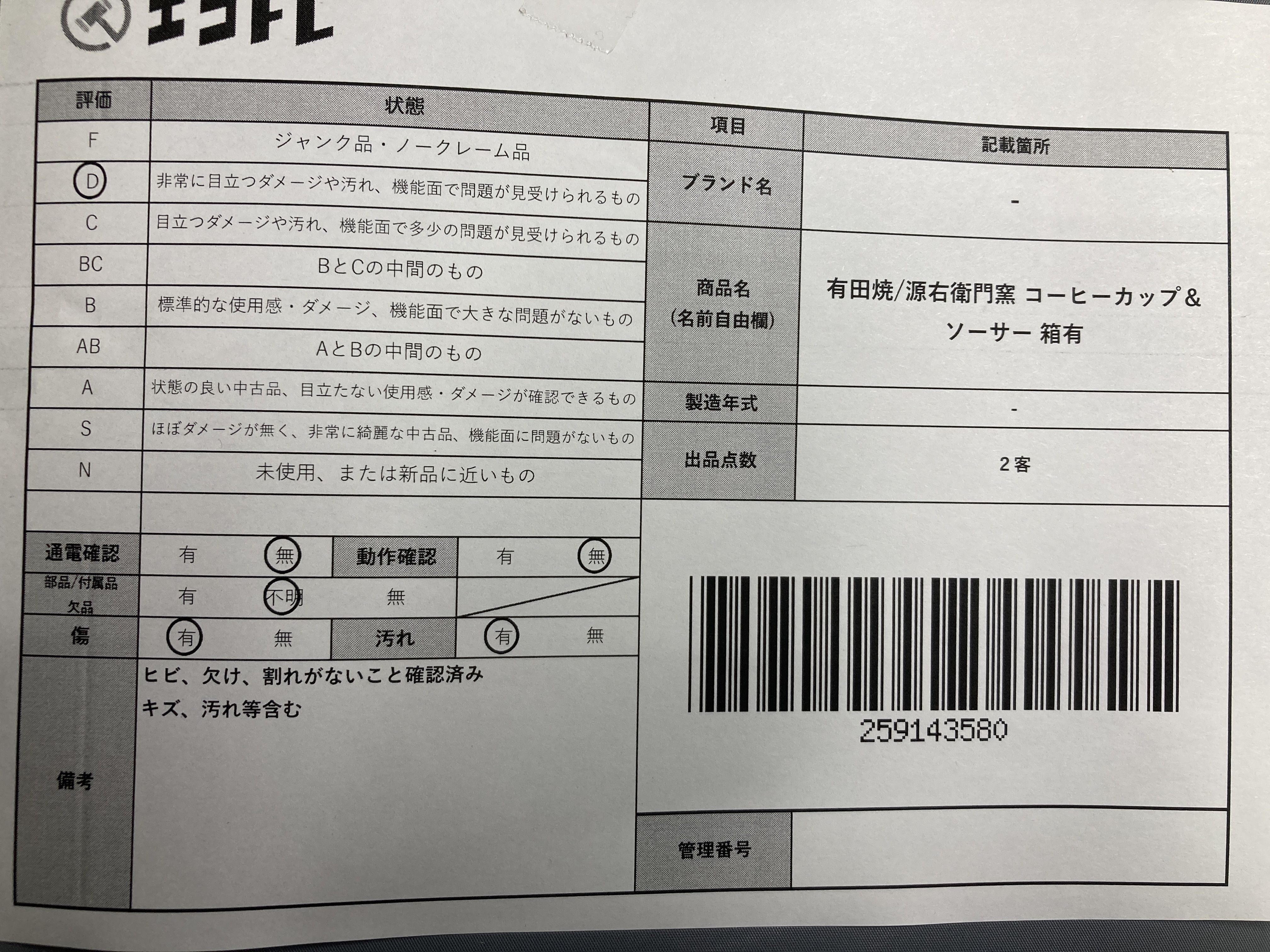 ▼SHIPPING TO JPN ONLY▼ 商品内容によって、JITBOXなどでの発送となる可能性がございます事ご理解下さい。年式などの商品情報詳細は写真にてご確認願います。※ご入札の際はご利用規約をよくお読みになってからのご参加お願いします。","タイプライン":"","カテゴリ":"陶器","形状コード":"カップ&ソーサー","付属品コード":"","シリアル・シール・型番":""