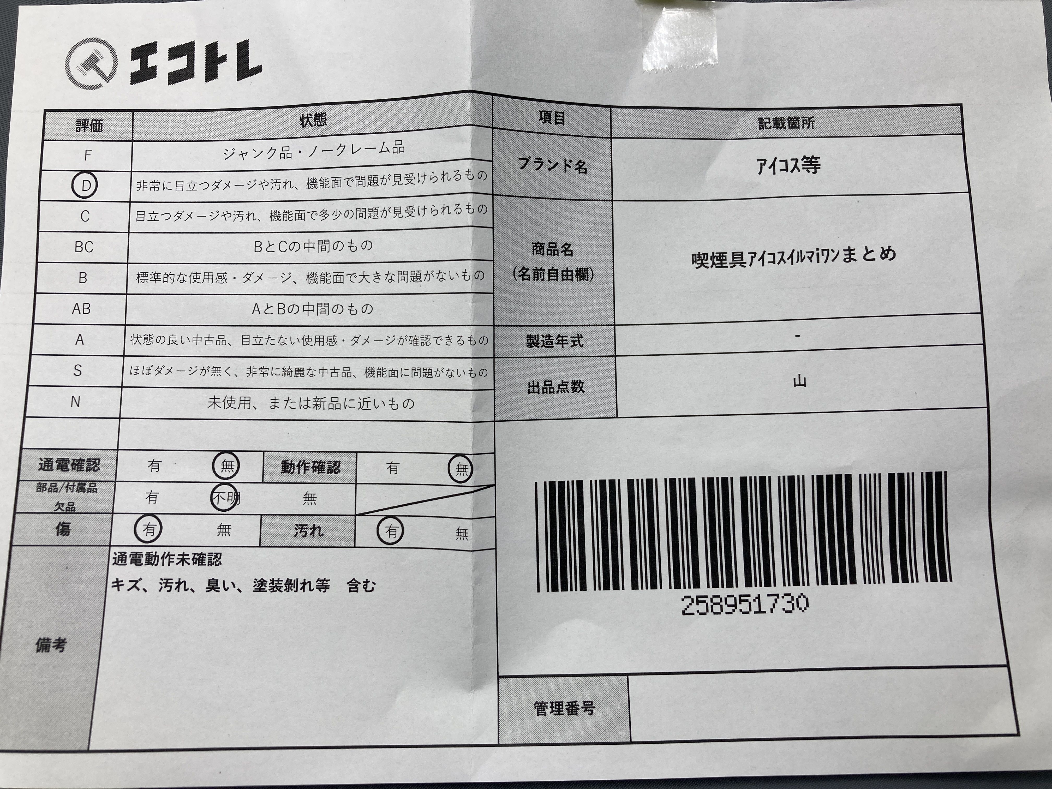 ▼SHIPPING TO JPN ONLY▼ 商品内容によって、JITBOXなどでの発送となる可能性がございます事ご理解下さい。年式などの商品情報詳細は写真にてご確認願います。※ご入札の際はご利用規約をよくお読みになってからのご参加お願いします。","タイプライン":"","カテゴリ":"喫煙具","形状コード":"電子タバコ","付属品コード":"","シリアル・シール・型番":""