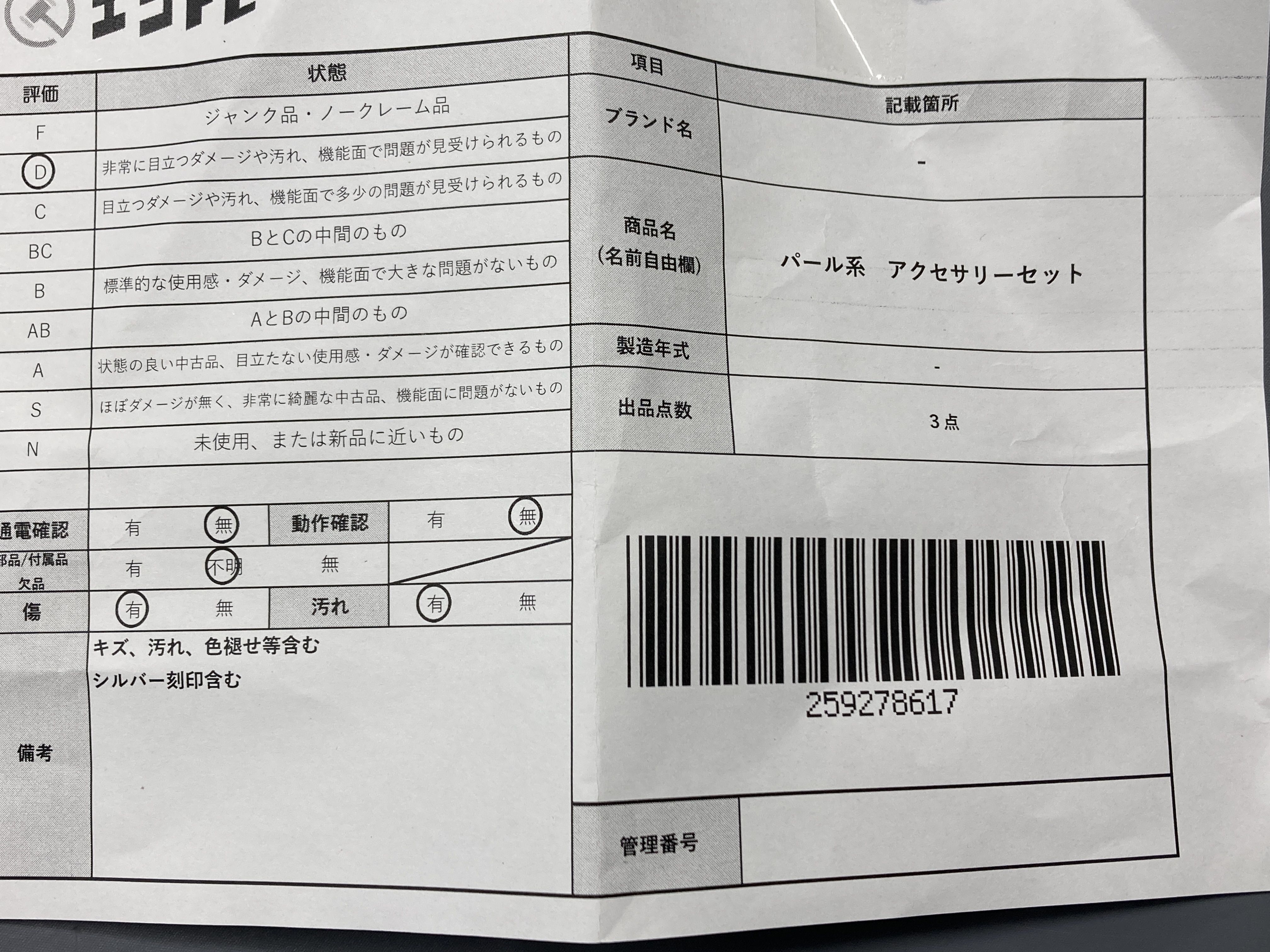 ▼SHIPPING TO JPN ONLY▼ 商品内容によって、JITBOXなどでの発送となる可能性がございます事ご理解下さい。年式などの商品情報詳細は写真にてご確認願います。※ご入札の際はご利用規約をよくお読みになってからのご参加お願いします。","タイプライン":"","カテゴリ":"アクセサリー","形状コード":"アクセサリーまとめ","付属品コード":"","シリアル・シール・型番":""