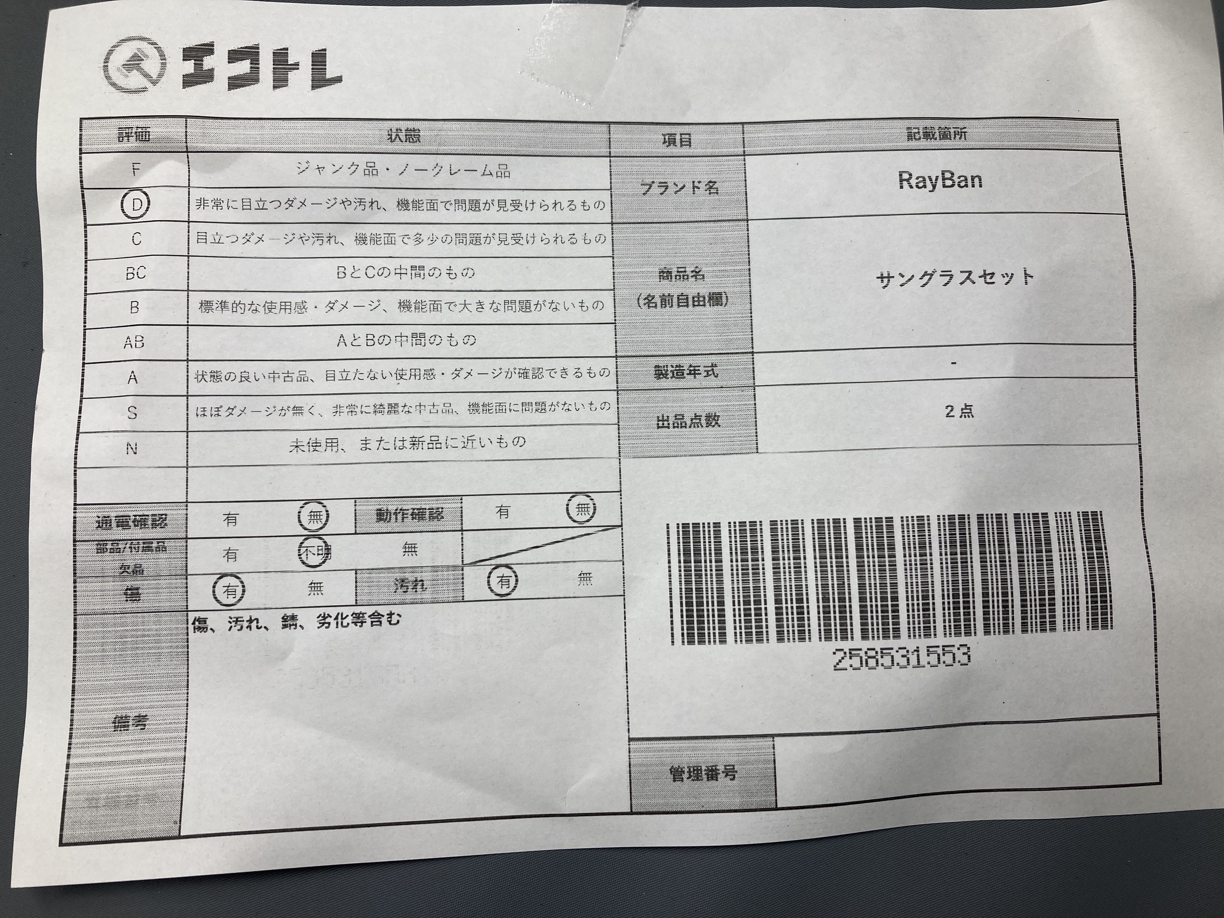 ◆CAN’T SHIPPING TO USA◆▼SHIPPING TO JPN ONLY▼ 商品内容によって、JITBOXなどでの発送となる可能性がございます事ご理解下さい。年式などの商品情報詳細は写真にてご確認願います。※ご入札の際はご利用規約をよくお読みになってからのご参加お願いします。","タイプライン":"","カテゴリ":"小物","形状コード":"サングラス・メガネ","付属品コード":"","シリアル・シール・型番":""