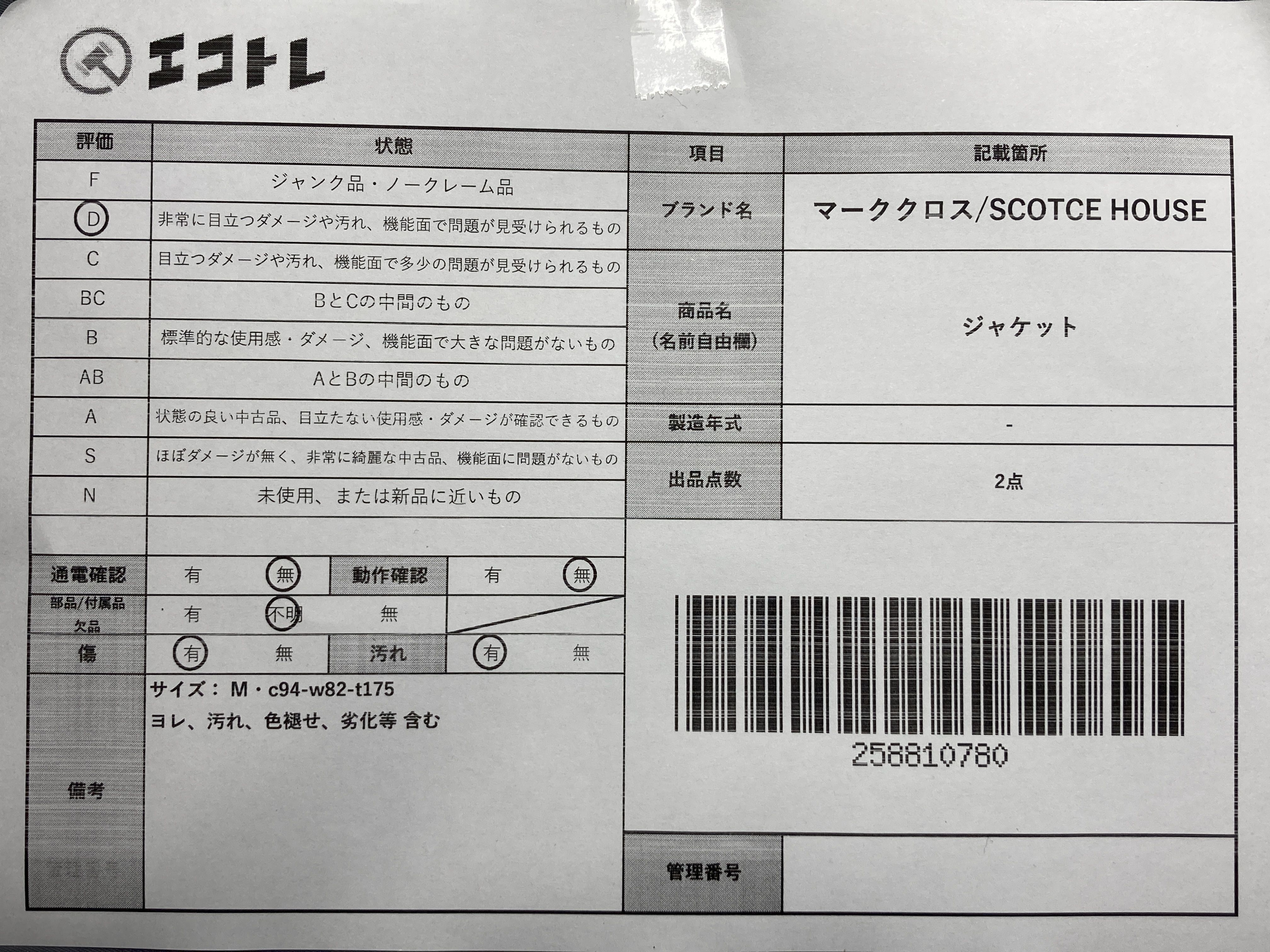 ▼SHIPPING TO JPN ONLY▼ 商品内容によって、JITBOXなどでの発送となる可能性がございます事ご理解下さい。年式などの商品情報詳細は写真にてご確認願います。※ご入札の際はご利用規約をよくお読みになってからのご参加お願いします。","タイプライン":"","カテゴリ":"アパレル","形状コード":"ジャケット","付属品コード":"","シリアル・シール・型番":""