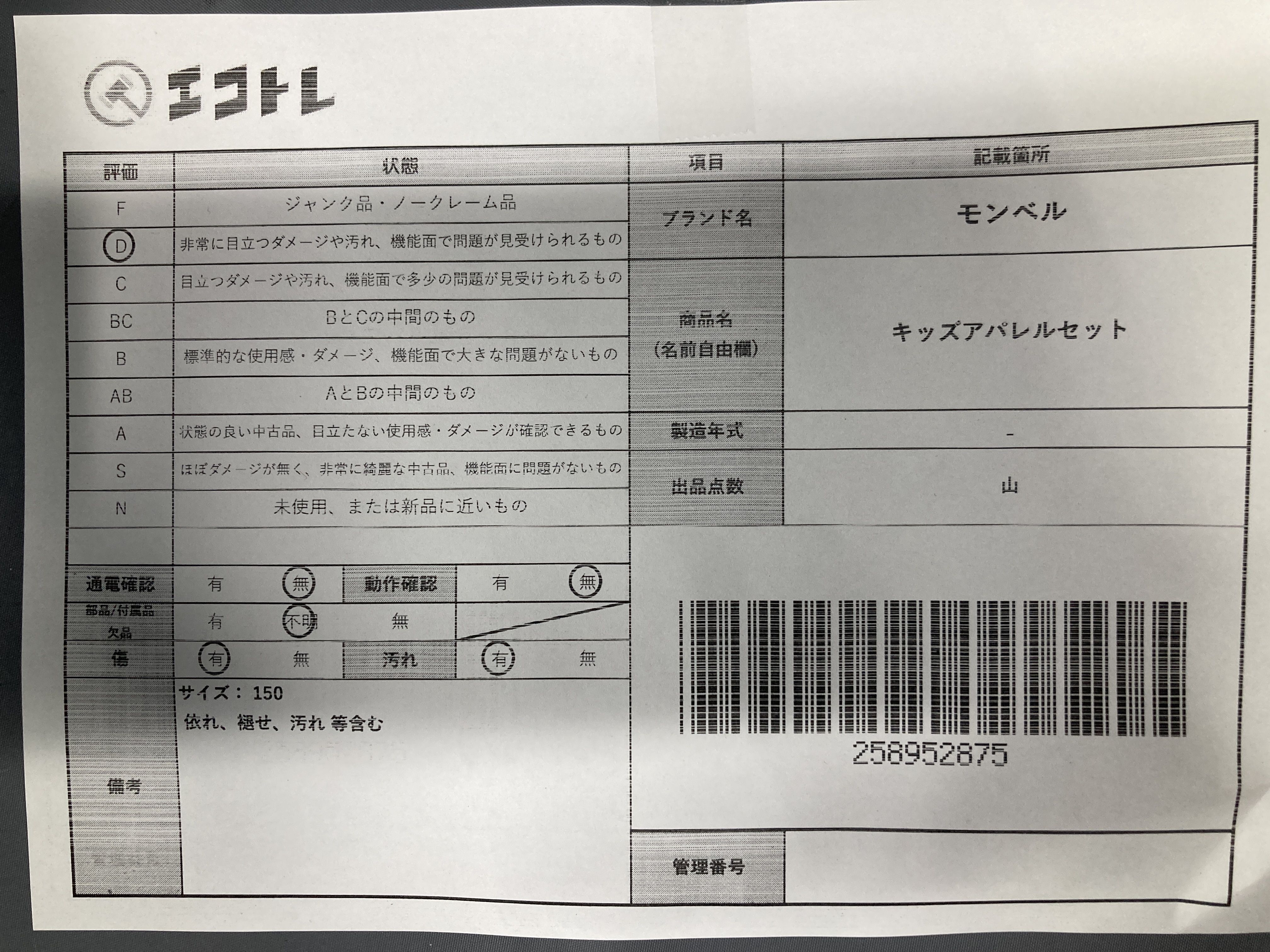 ▼SHIPPING TO JPN ONLY▼ 商品内容によって、JITBOXなどでの発送となる可能性がございます事ご理解下さい。年式などの商品情報詳細は写真にてご確認願います。※ご入札の際はご利用規約をよくお読みになってからのご参加お願いします。","タイプライン":"","カテゴリ":"アパレル","形状コード":"パンツ","付属品コード":"","シリアル・シール・型番":"150cm"