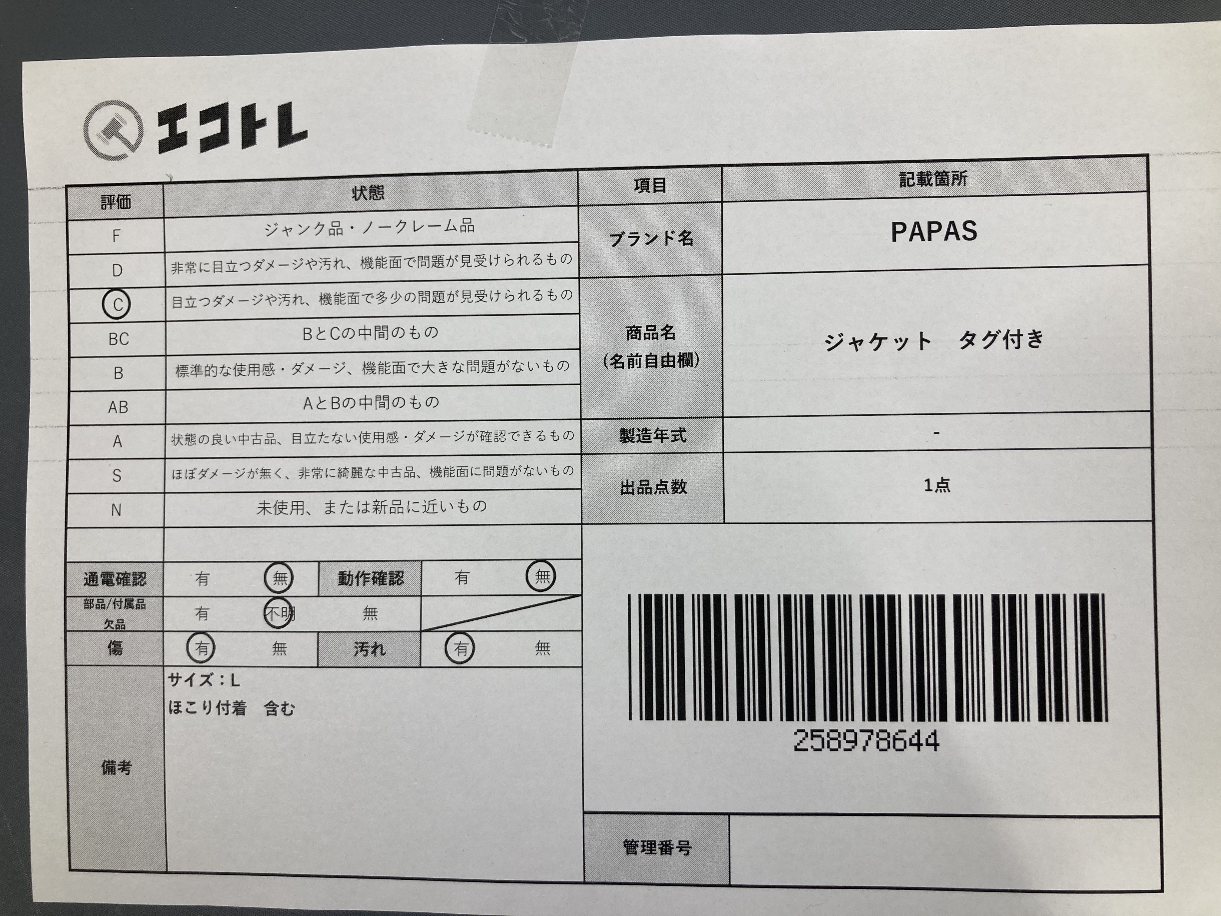 (A_0596)▼PAPAS ジャケット タグ付き