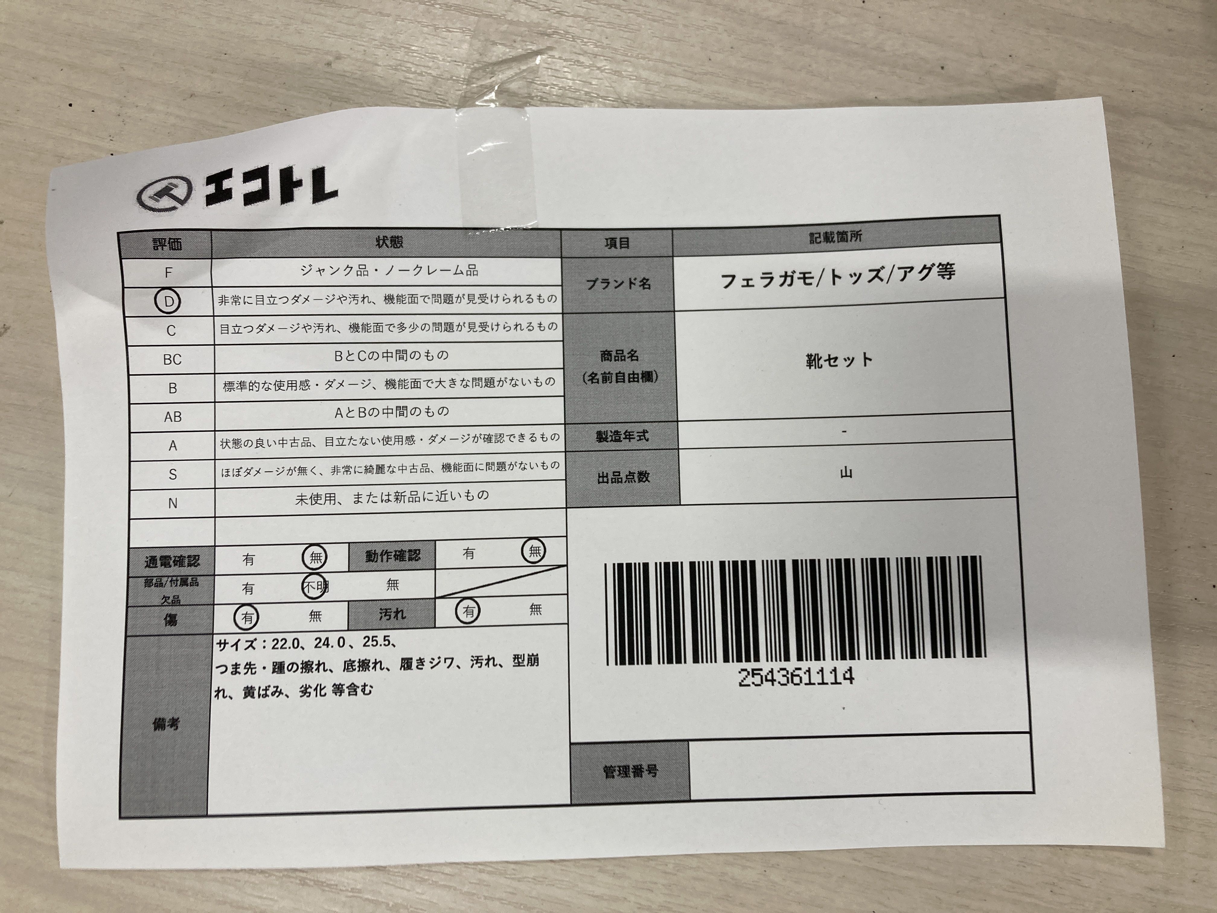 | "描述":"注意事項: | ▼SHIPPING TO JPN ONLY▼ 商品内容によって、JITBOXなどでの発送となる可能性がございます事ご理解下さい。年式などの商品情報詳細は写真にてご確認願います。※ご入札の際はご利用規約をよくお読みになってからのご参加お願いします。 部品/付属品 欠品 (中) 傷 (有) 汚れ (有) サイズ:22.0、24.0、25.5、つま先・踵の擦れ、底擦れ、履きジワ、汚れ、型崩れ、黄ばみ、劣化 等含む","タイプライン":"","カテゴリ":"靴","形状コード":"その他靴","付属品コード":"","シリアル・シール・型番":"" |