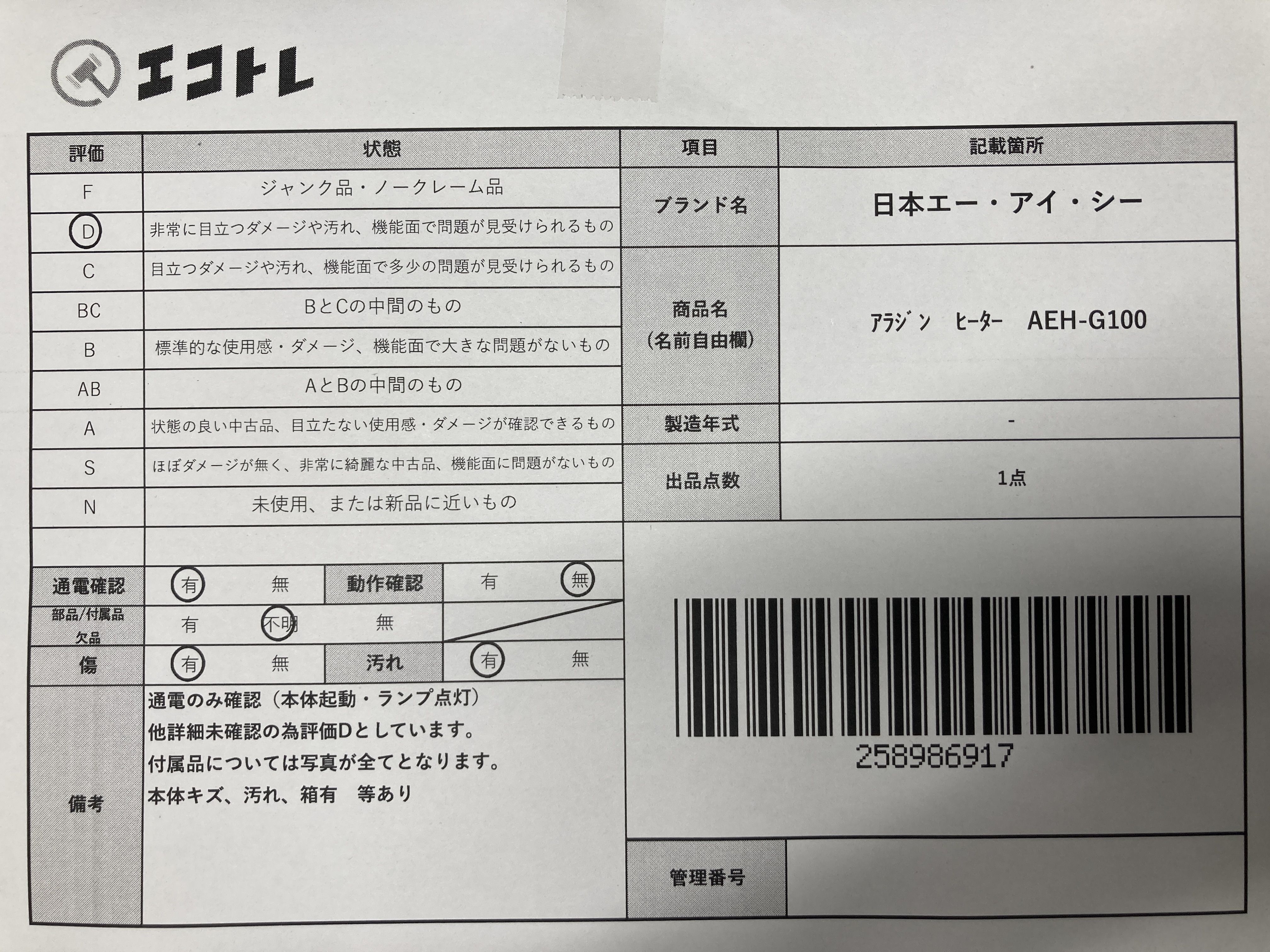 ▼SHIPPING TO JPN ONLY▼ 商品内容によって、JITBOXなどでの発送となる可能性がございます事ご理解下さい。年式などの商品情報詳細は写真にてご確認願います。※ご入札の際はご利用規約をよくお読みになってからのご参加お願いします。","タイプライン":"","カテゴリ":"家電","形状コード":"その他家電","付属品コード":"","シリアル・シール・型番":""