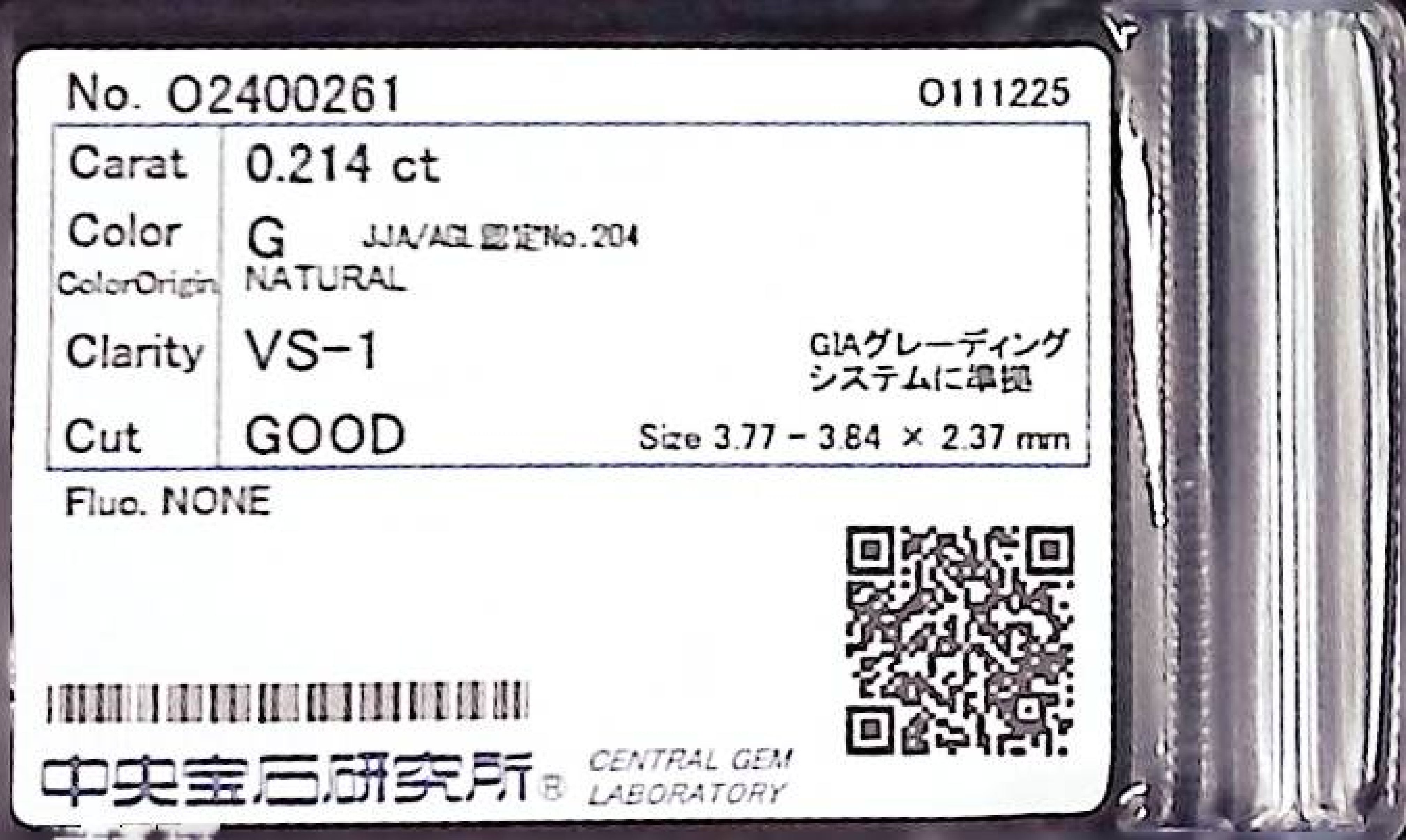 (10980_0031)0.214ct G VS-1 GOOD/GD/FR NONE NATURAL 3.77-3.84X2.37mm ダイヤ・ルース