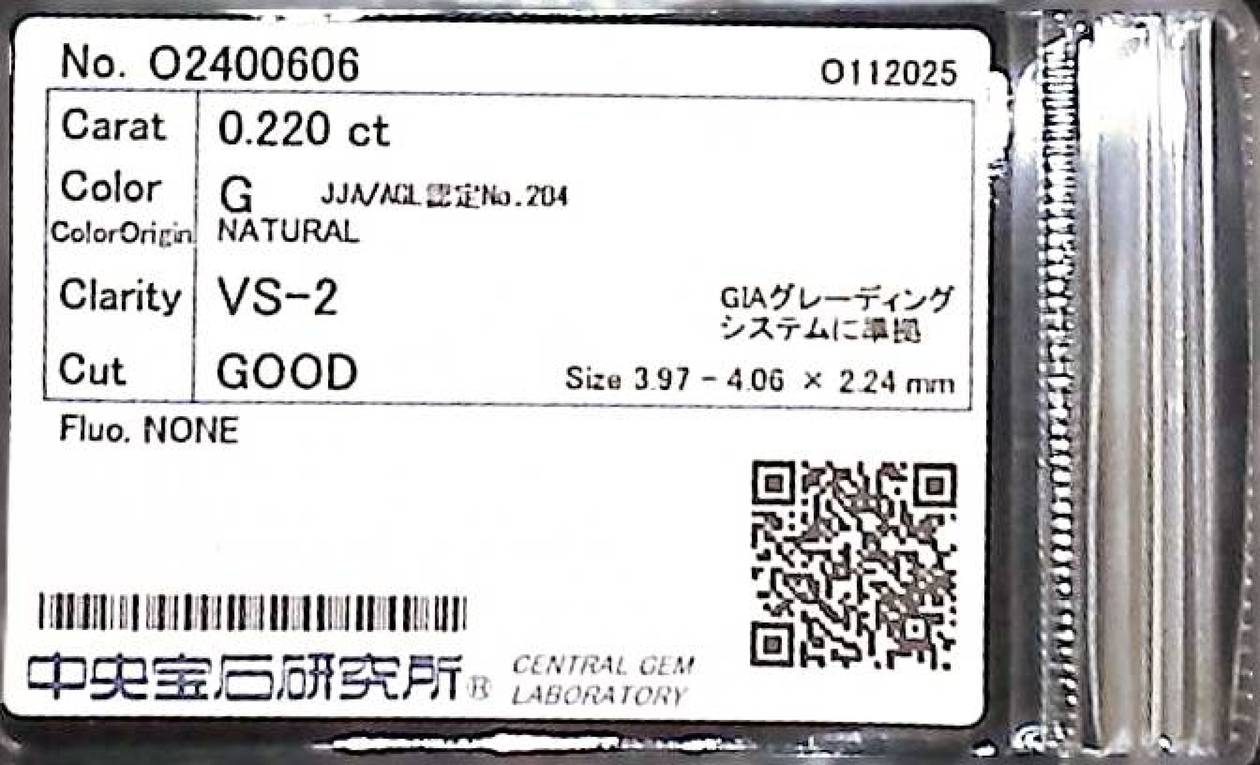 (10980_0037)0.220ct G VS-2 GOOD/GD/FR NONE NATURAL 3.97-4.06X2.24mm ダイヤ・ルース