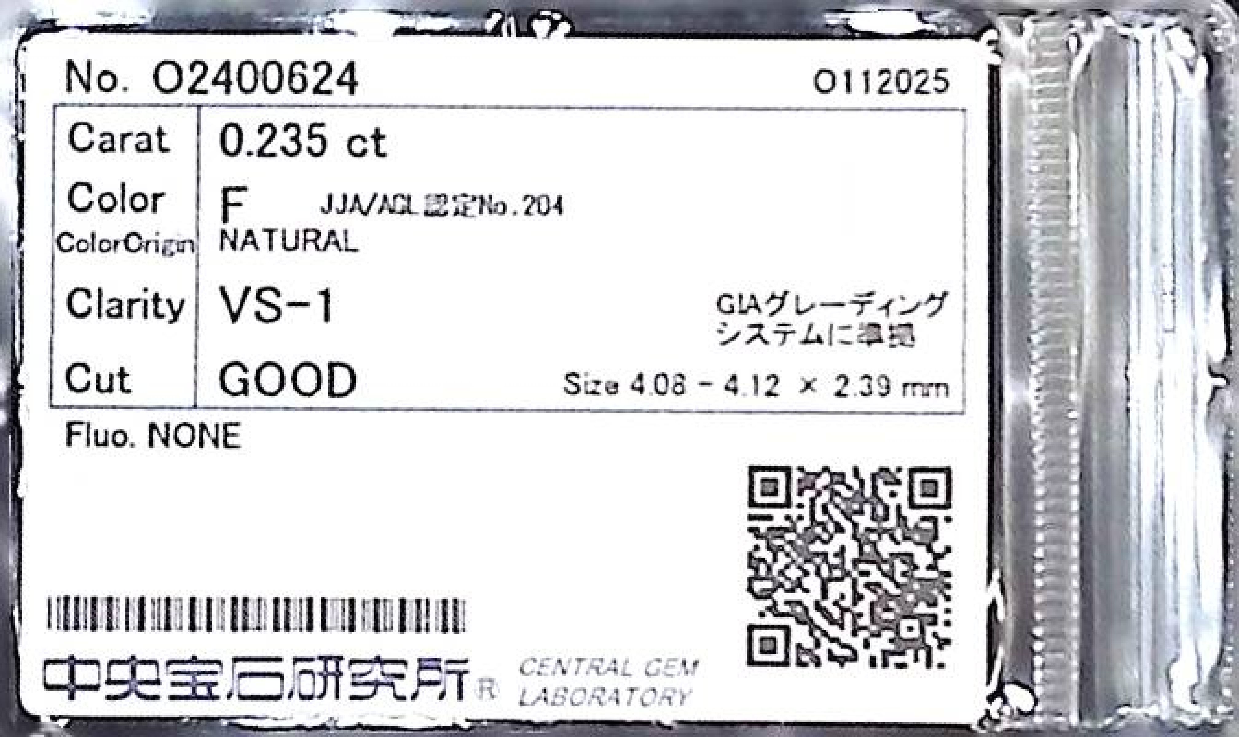 (10980_0060)0.235ct F VS-1 GOOD/GD/FR NONE NATURAL 4.08-4.12X2.39mm ダイヤ・ルース