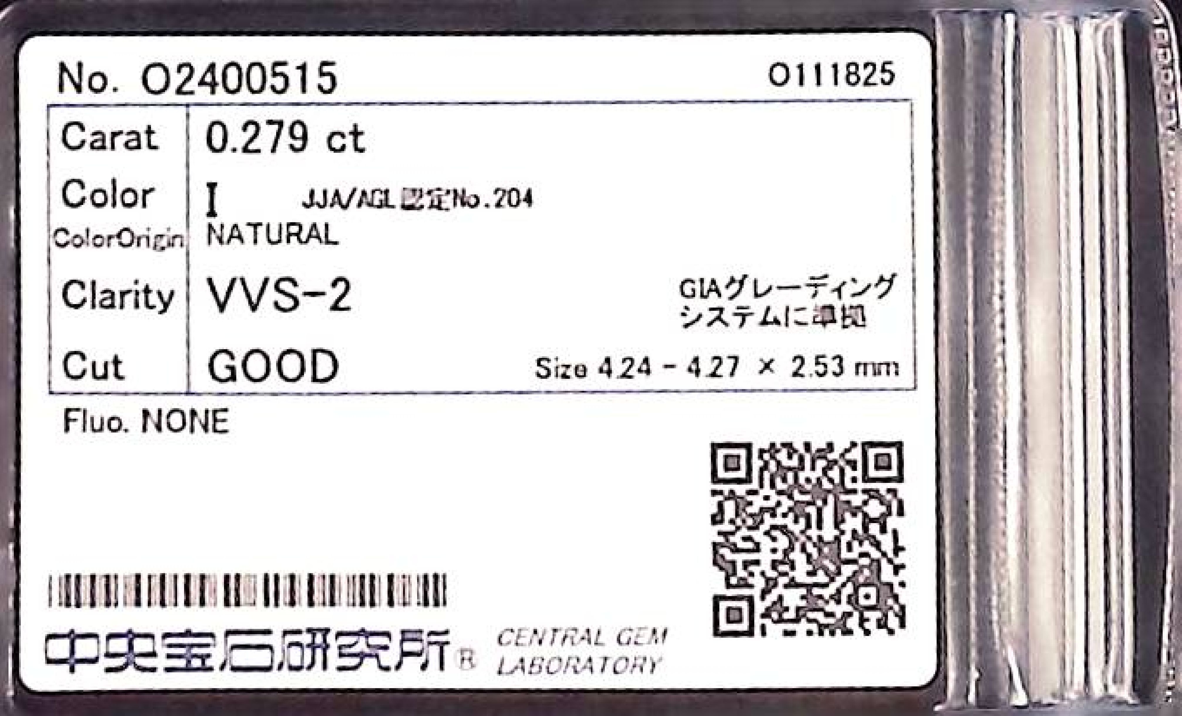 (10980_0131)0.279ct I VVS-2 GOOD/VG/GD NONE NATURAL 4.24-4.27X2.53mm ダイヤ・ルース