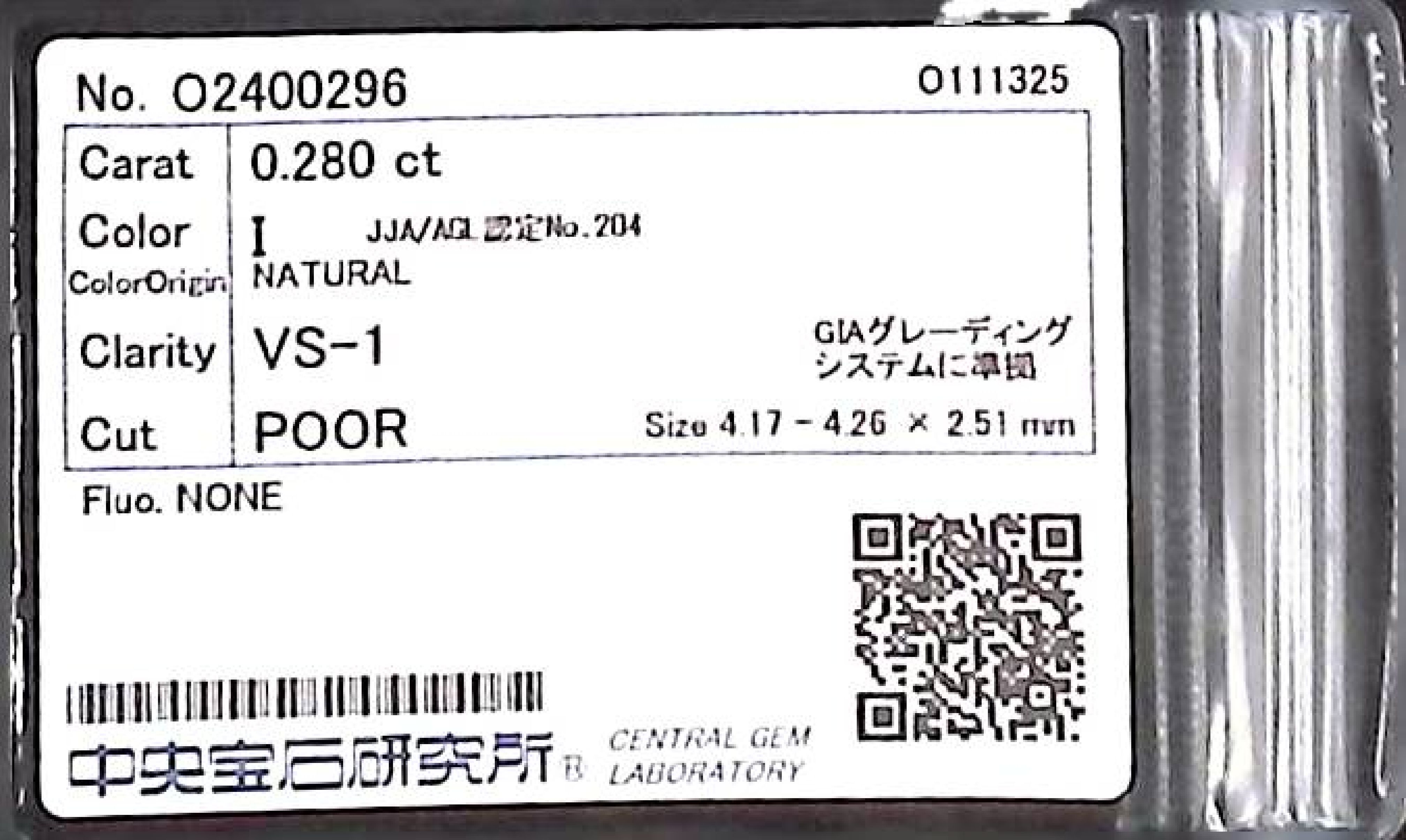 (10980_0135)0.280ct I VS-1 POOR/GD/FR NONE NATURAL 4.17-4.26X2.51mm ダイヤ・ルース