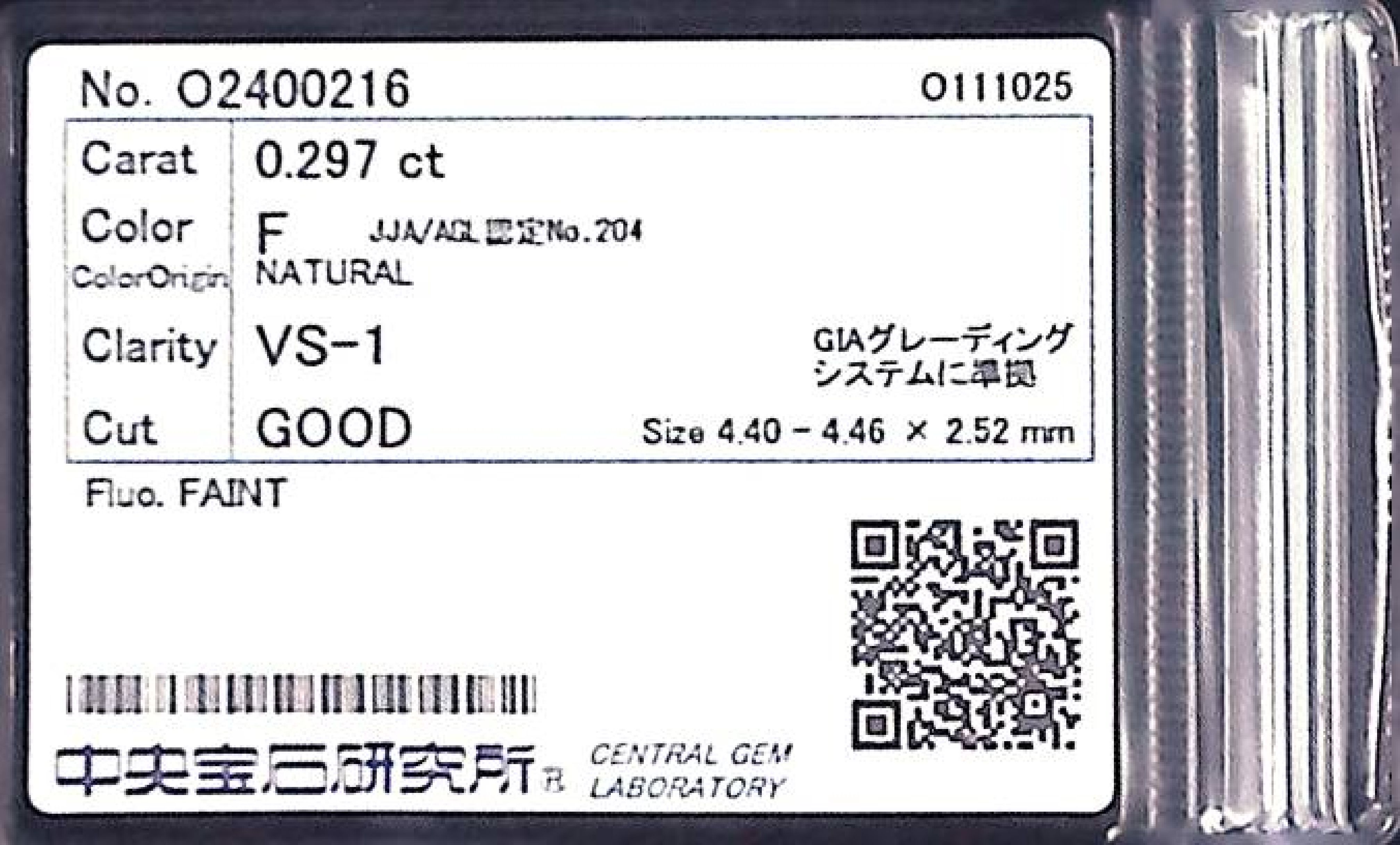 (10980_0156)0.297ct F VS-1 GOOD/VG/GD FAINT NATURAL 4.40-4.46X2.52mm ダイヤ・ルース