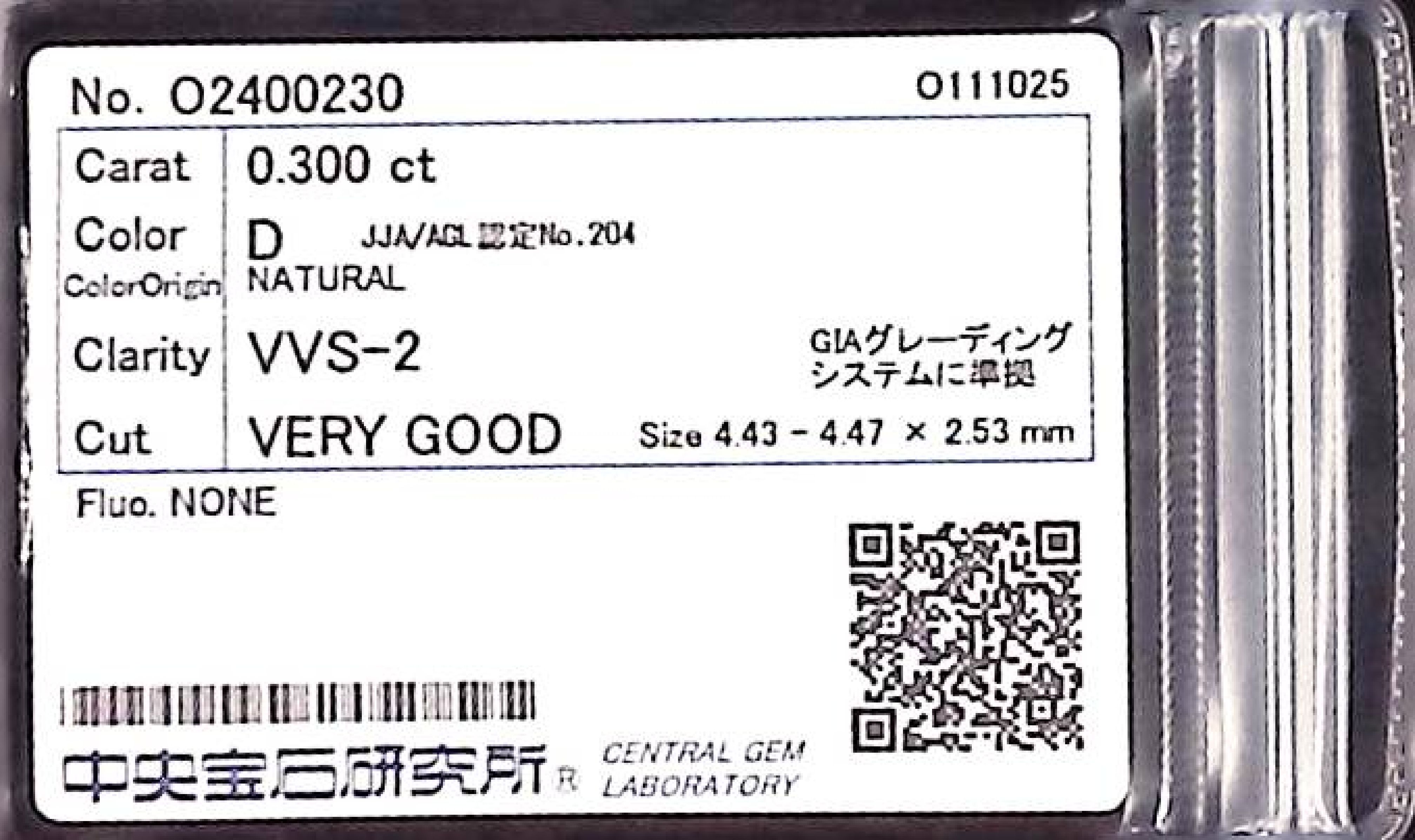 (10980_0159)0.300ct D VVS-2 VERY GOOD/VG/GD NONE NATURAL 4.43-4.47X2.53mm ダイヤ・ルース