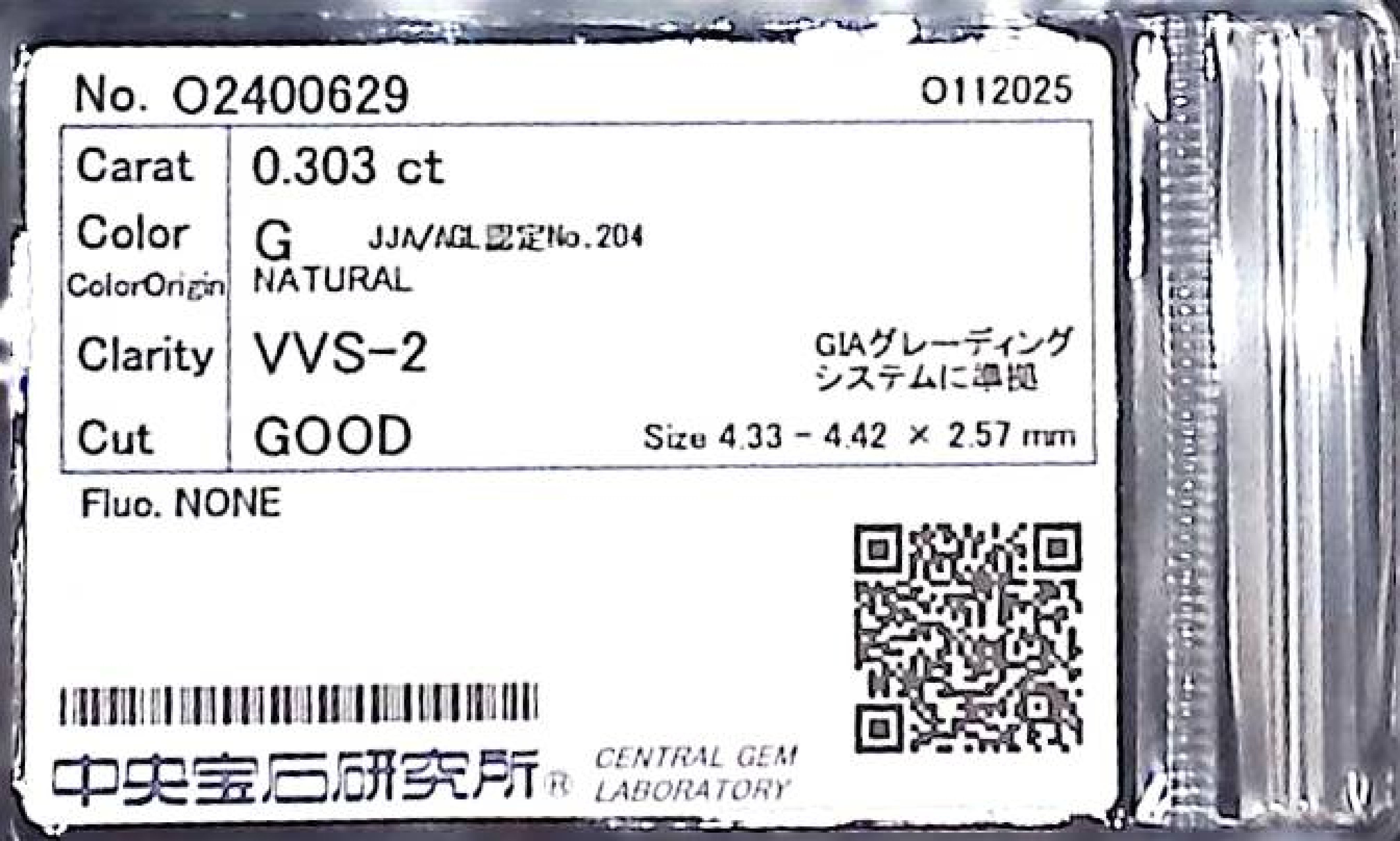 (10980_0172)0.303ct G VVS-2 GOOD/VG/FR NONE NATURAL 4.33-4.42X2.57mm ダイヤ・ルース