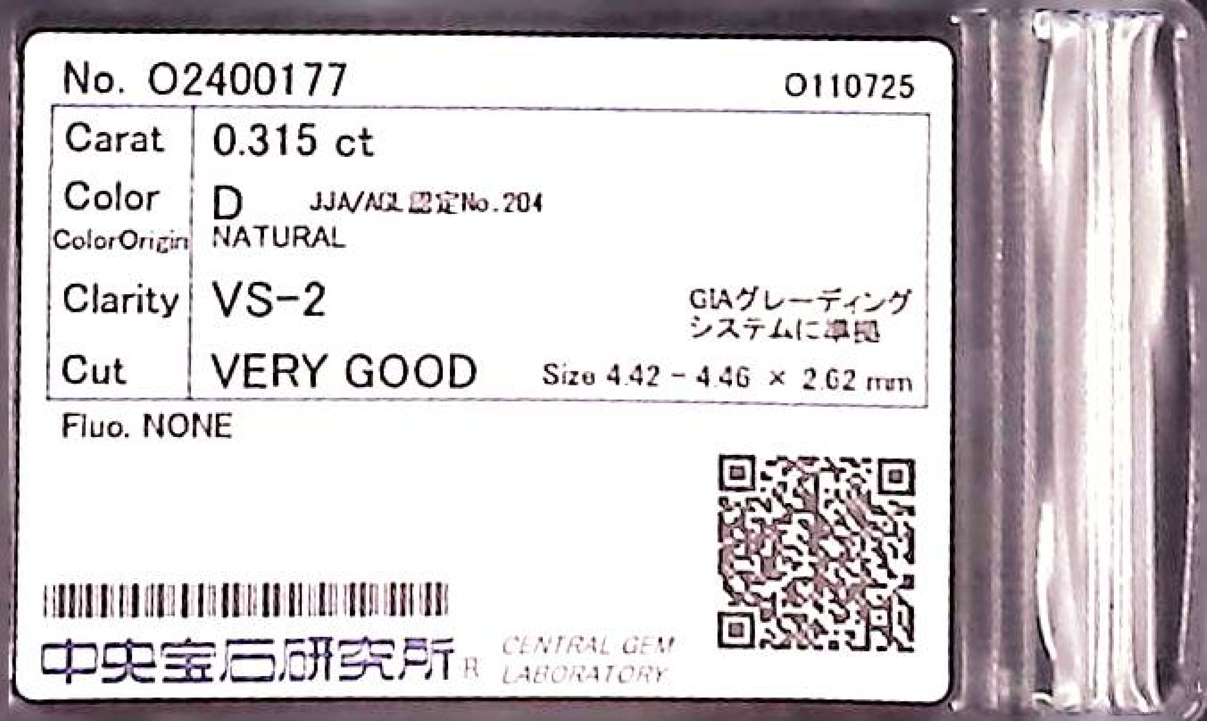 (10980_0202)0.315ct D VS-2 VERY GOOD/VG/GD NONE NATURAL 4.42-4.46X2.62mm ダイヤ・ルース