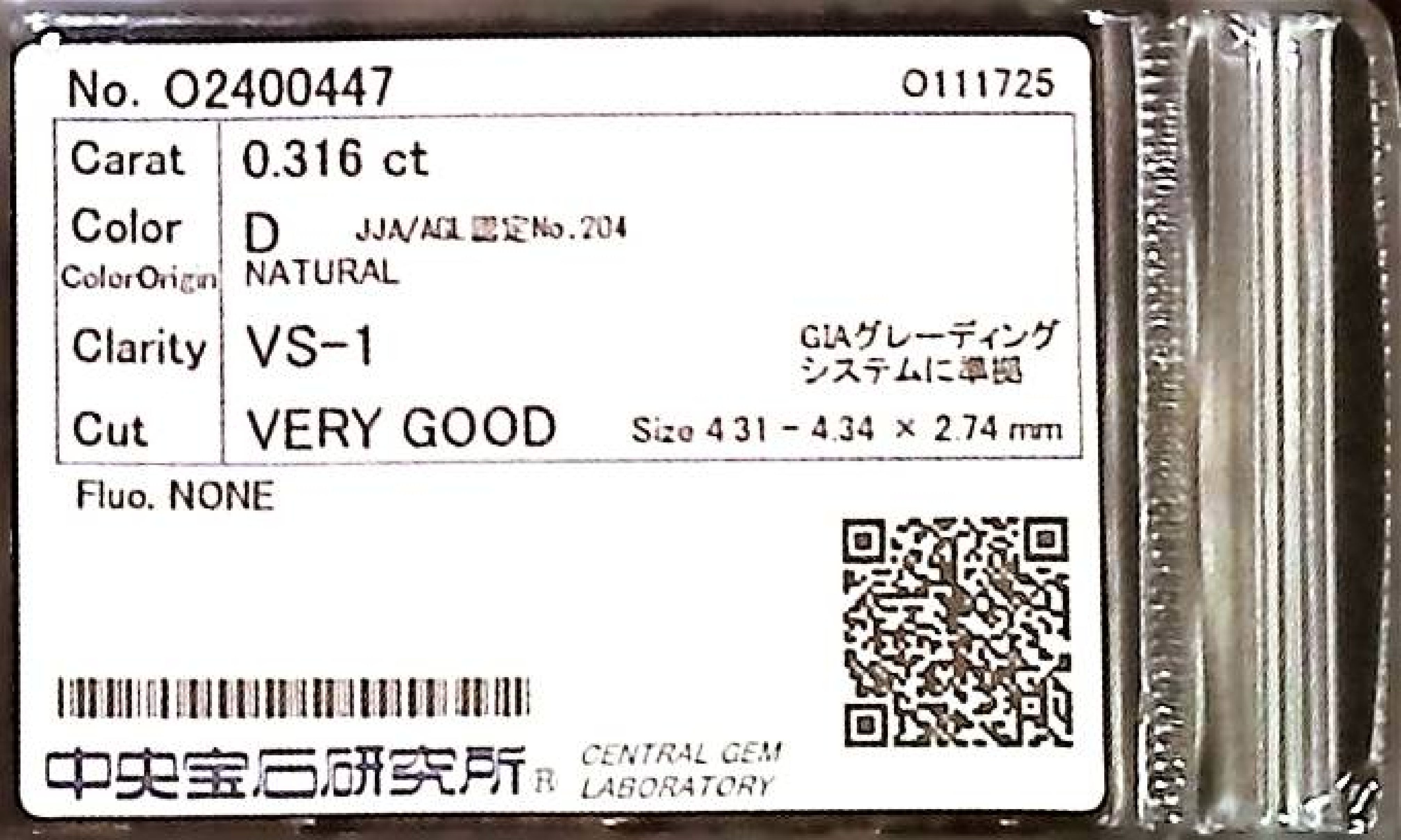 (10980_0204)0.316ct D VS-1 VERY GOOD/GD/GD NONE NATURAL 4.31-4.34X2.74mm ダイヤ・ルース