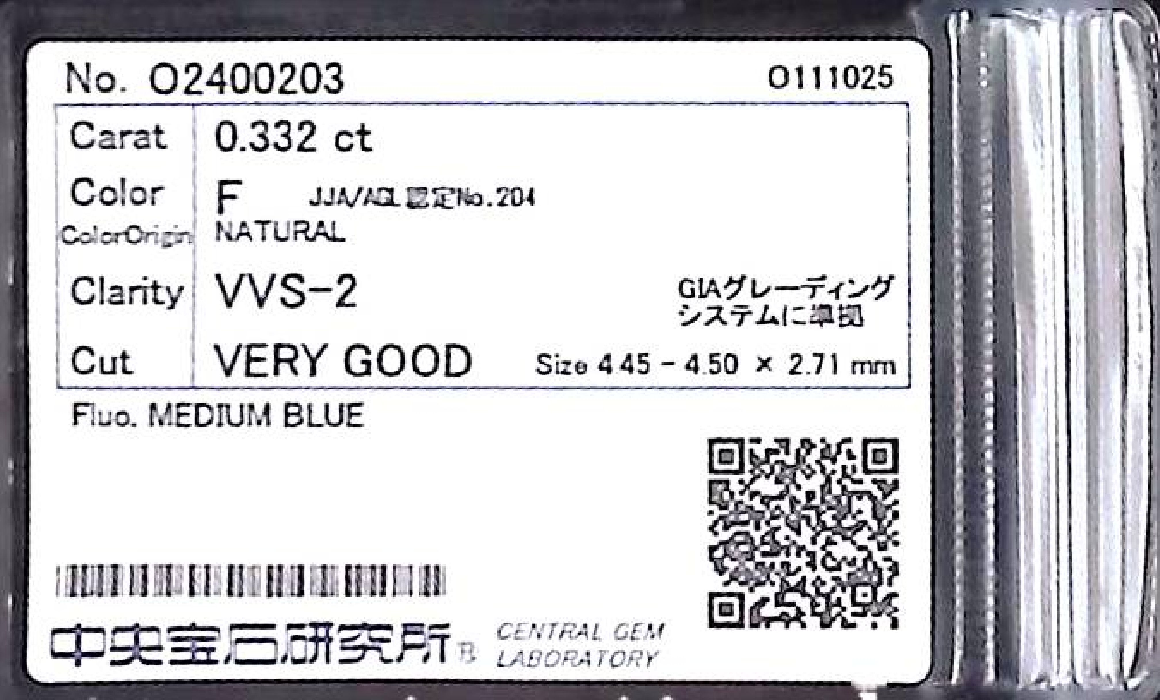 (10980_0241)0.332ct F VVS-2 VERY GOOD/VG/GD MEDIUM BLUE NATURAL 4.45-4.50X2.71mm ダイヤ・ルース