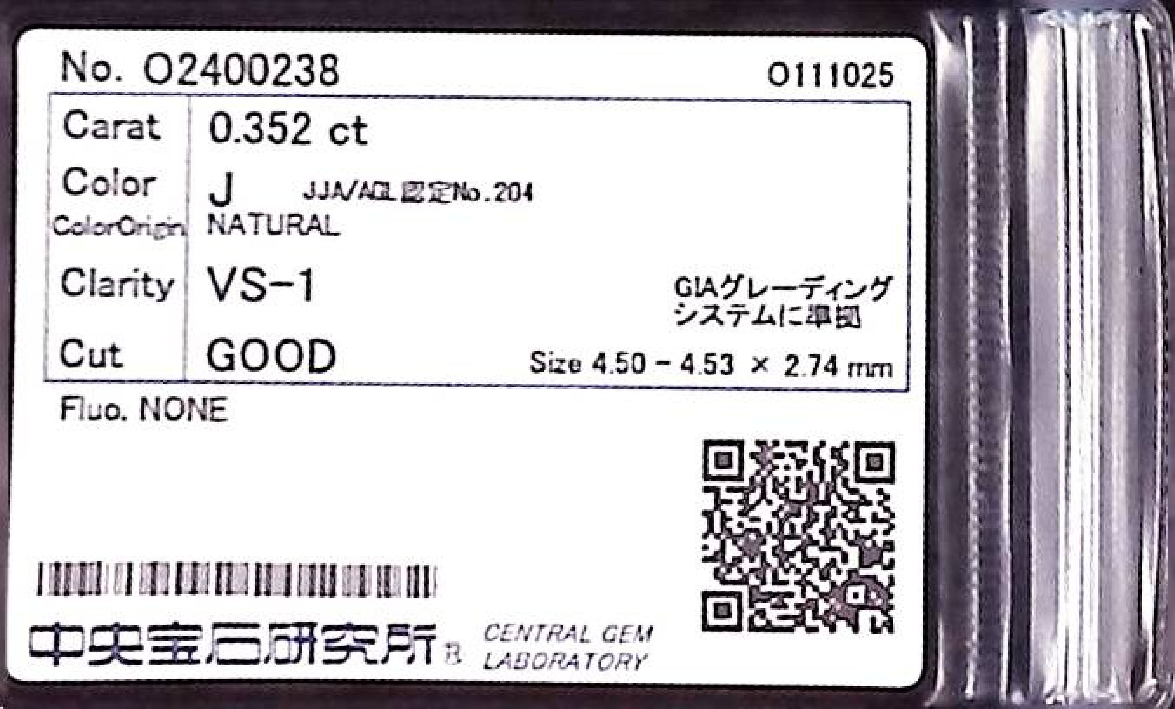 (10980_0276)0.352ct J VS-1 GOOD/GD/GD NONE NATURAL 4.50-4.53X2.74mm ダイヤ・ルース
