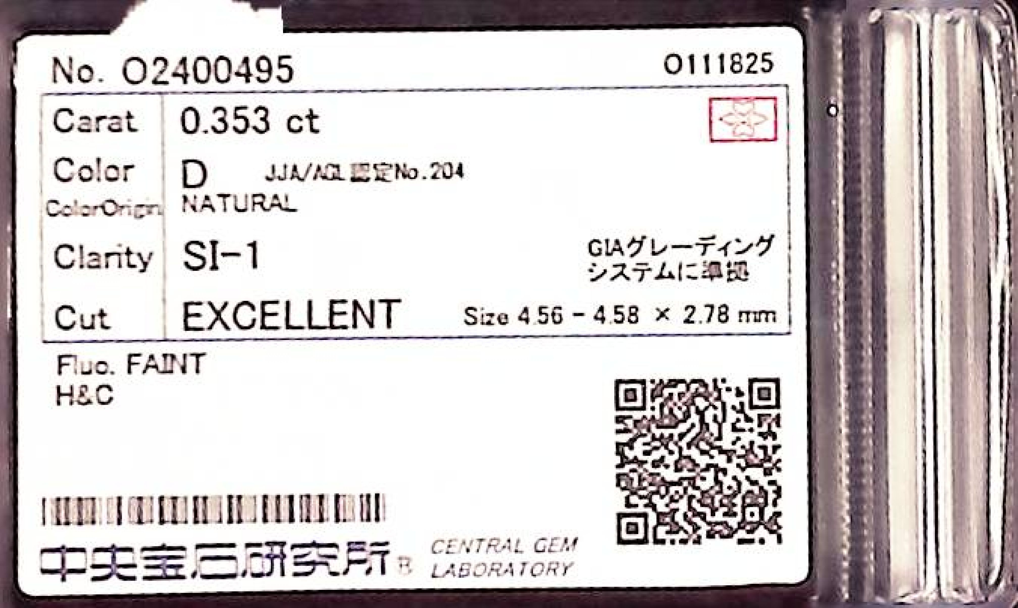 (10980_0277)0.353ct D SI-1 EXCELLENT/VG/VG HC FAINT NATURAL 4.56-4.58X2.78mm ダイヤ・ルース