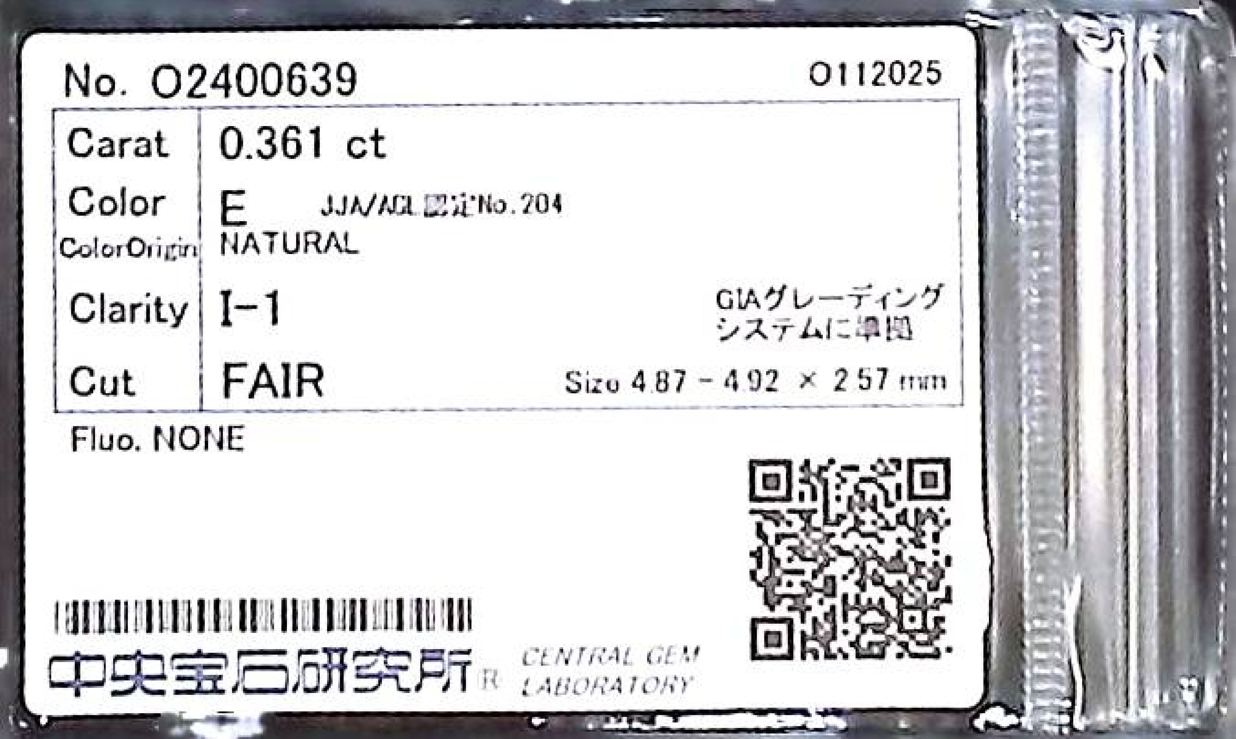 (10980_0290)0.361ct E I-1 FAIR/GD/FR NONE NATURAL 4.87-4.92X2.57mm ダイヤ・ルース