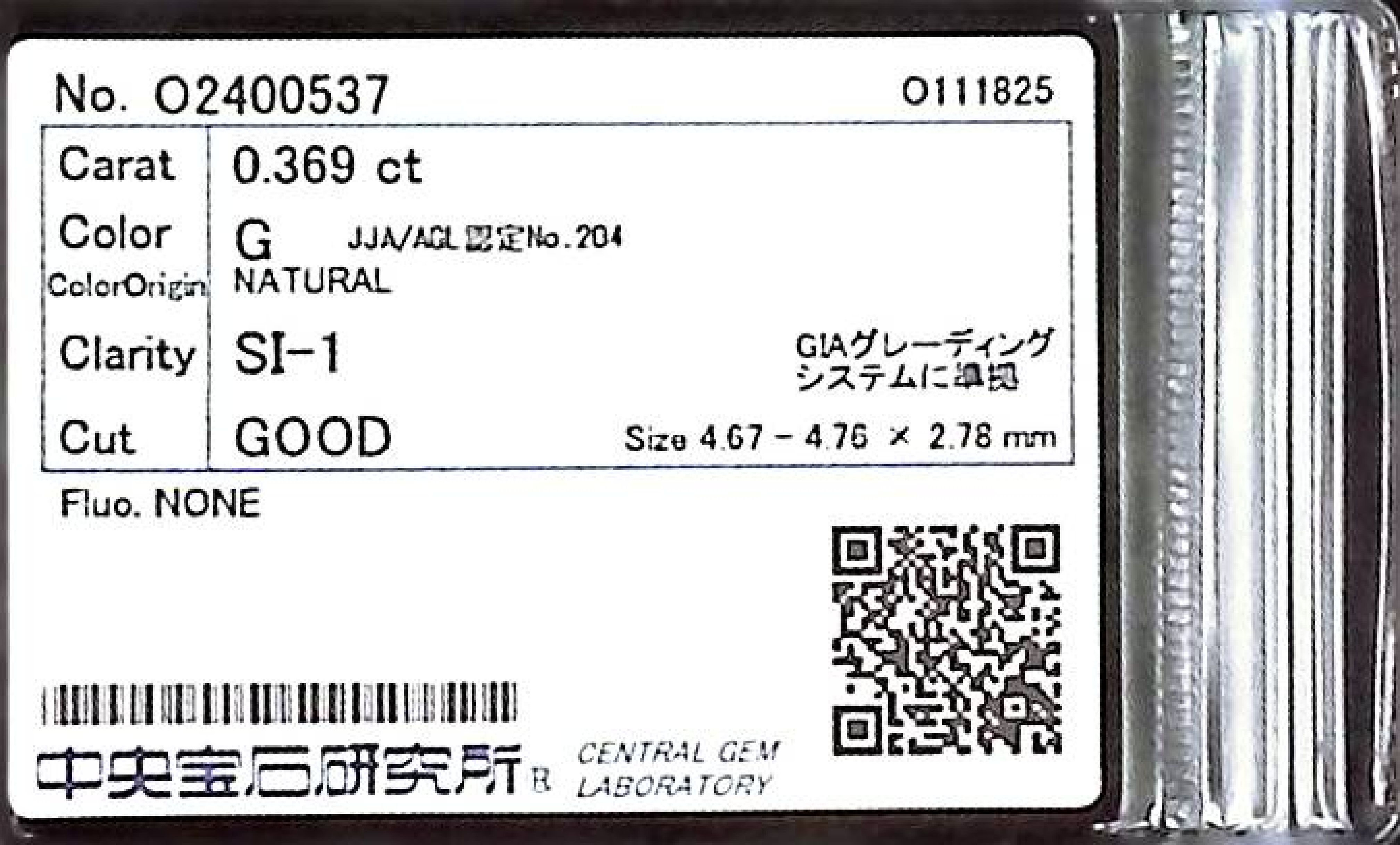 (10980_0301)0.369ct G SI-1 GOOD/GD/FR NONE NATURAL 4.67-4.76X2.78mm ダイヤ・ルース