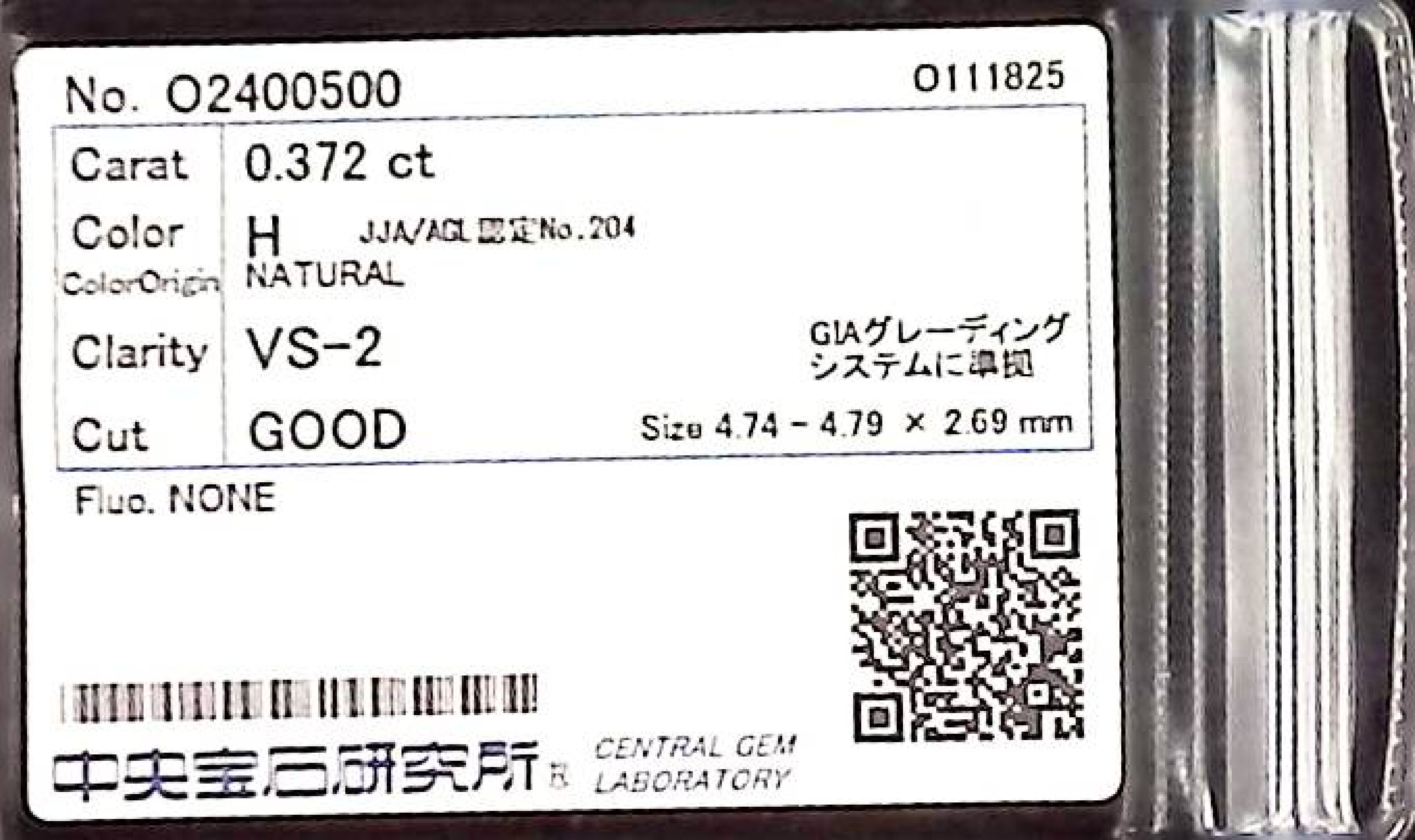 (10980_0307)0.372ct H VS-2 GOOD/VG/GD NONE NATURAL 4.74-4.79X2.69mm ダイヤ・ルース