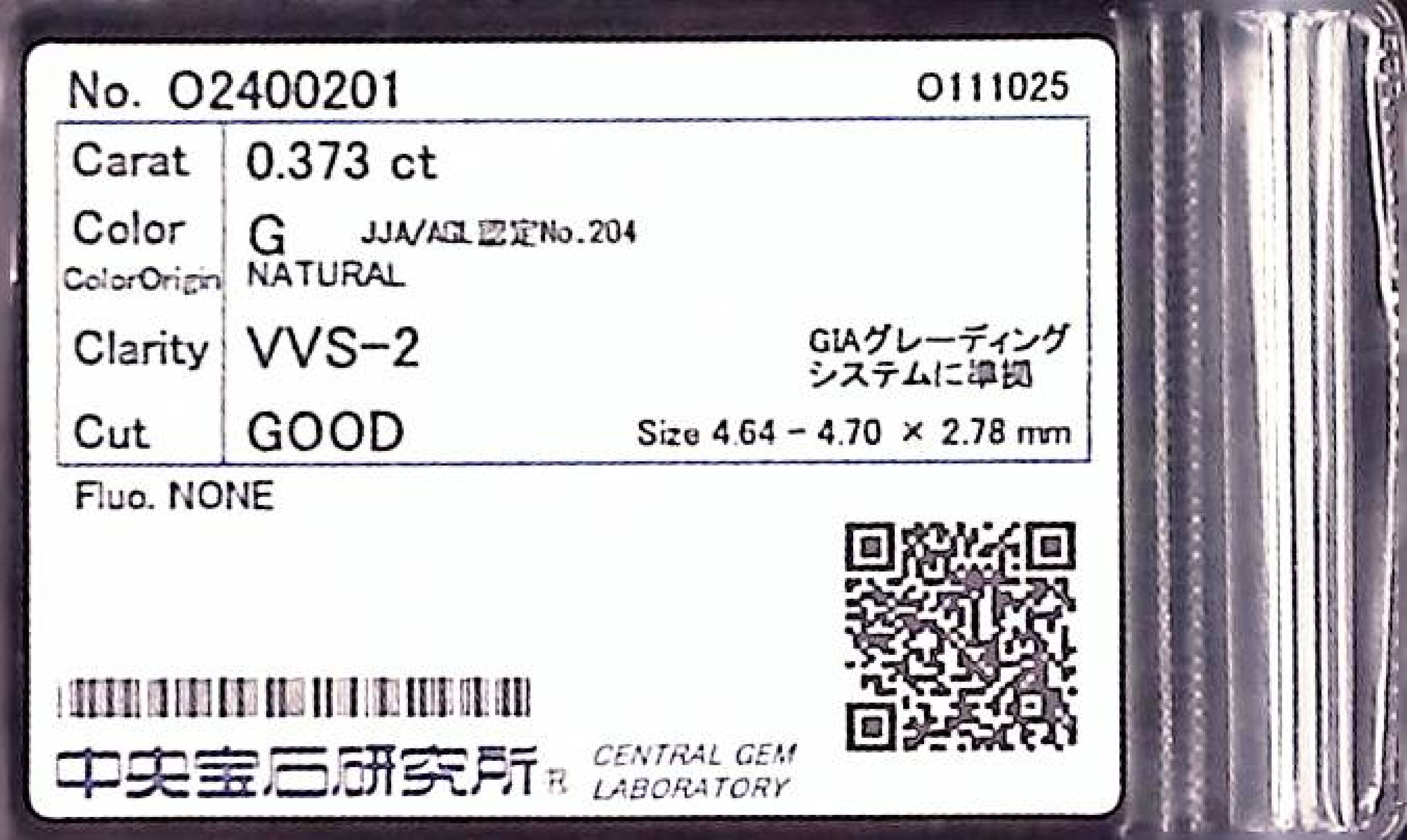 (10980_0309)0.373ct G VVS-2 GOOD/GD/FR NONE NATURAL 4.64-4.70X2.78mm ダイヤ・ルース